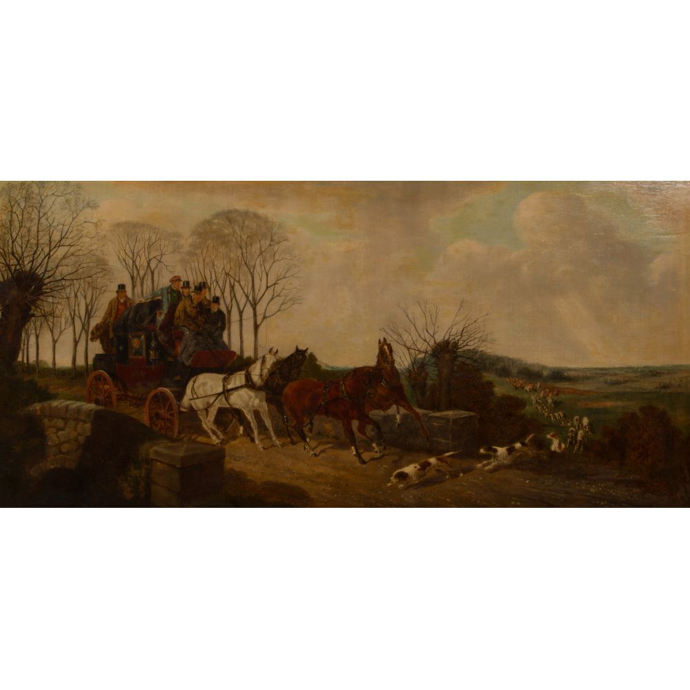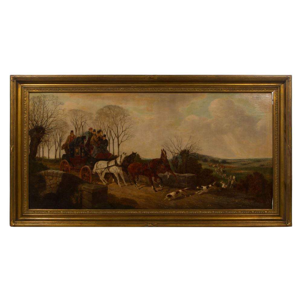 Undated and unsigned depiction of a coach full of gentlemen being delayed by the crossing of hounds at the lead of a hunting party, in a gold-tone carved wood frame retaining a Charles Daggett Gallery, London, label verso