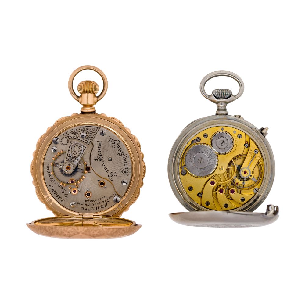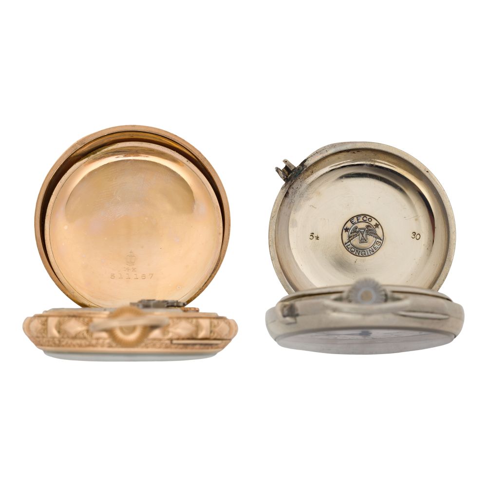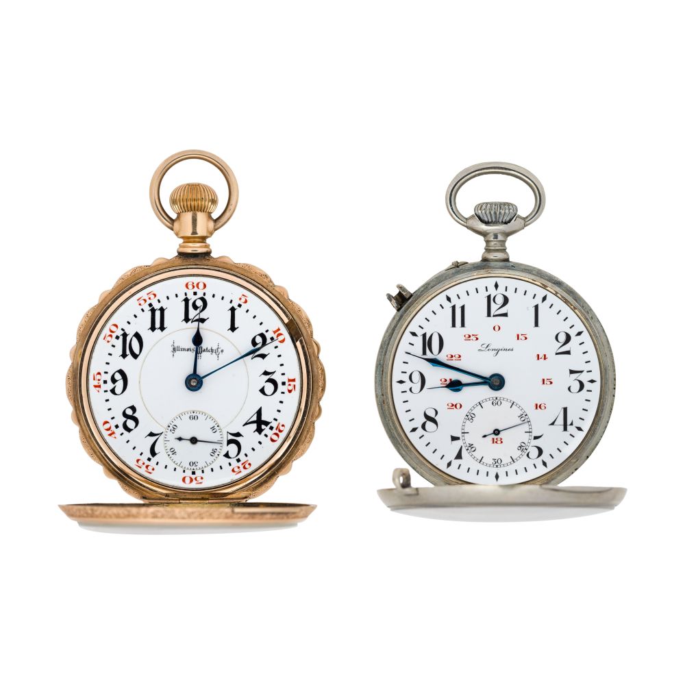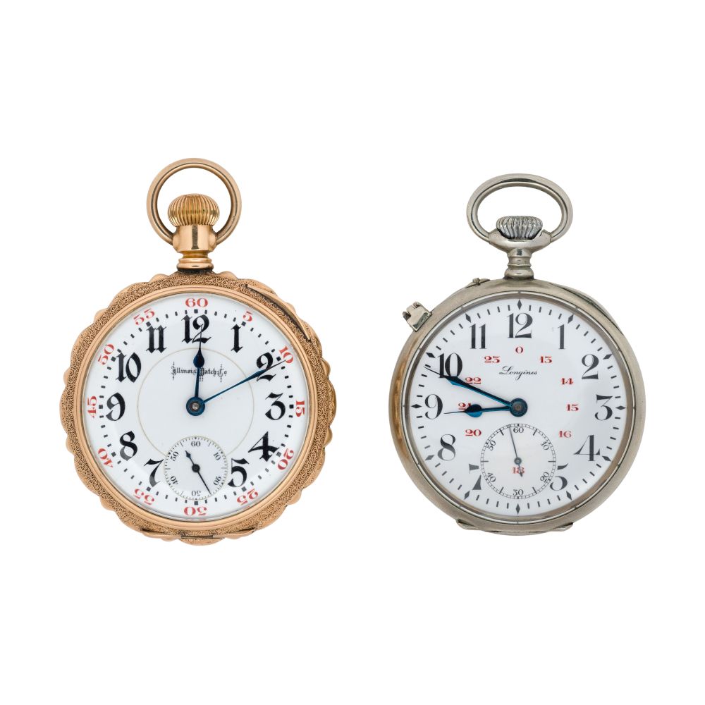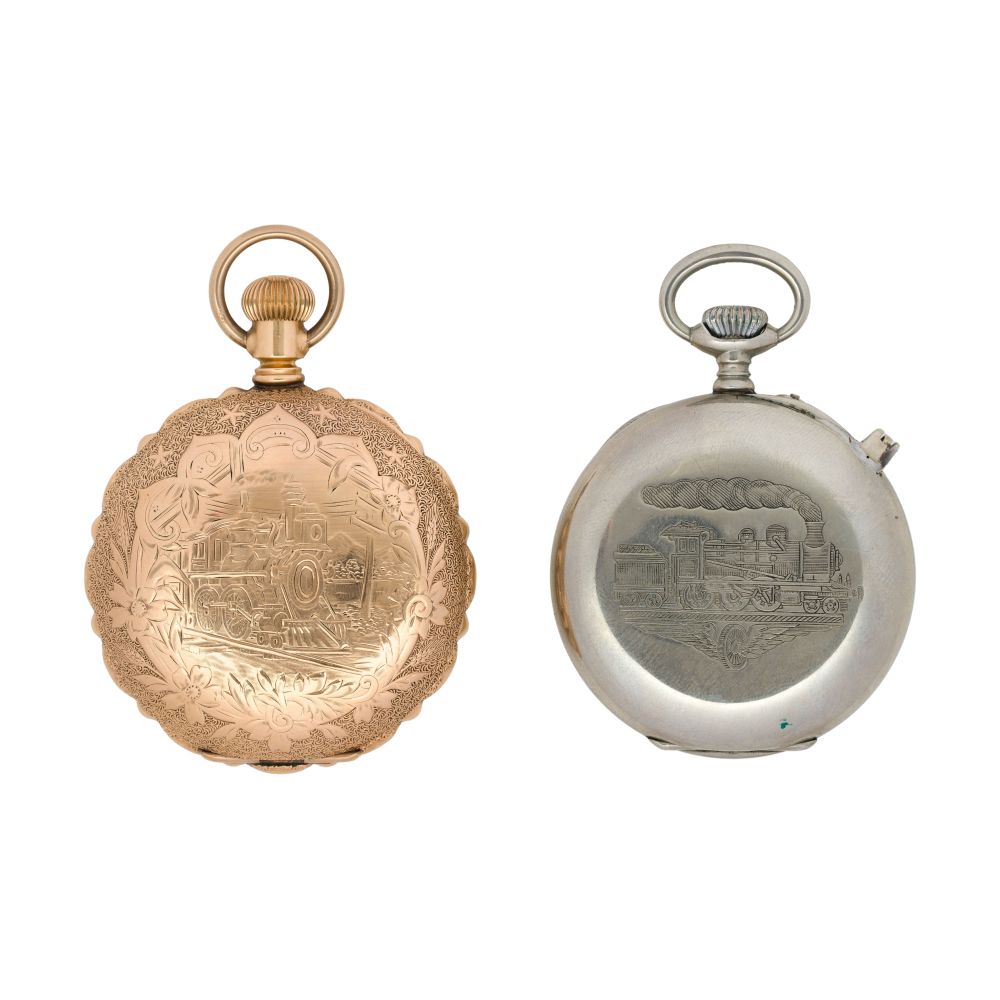 (2) total items including serial #1954267 dating to c.1907, 21-jewel movement, white dial having Arabic numerals, subsidiary dial for seconds, blue hands, stem wind, lever set, in gold-filled case with engraved train design on back; together with a Longines railroad open face serial #3985661 on the case, engraved train design on back
