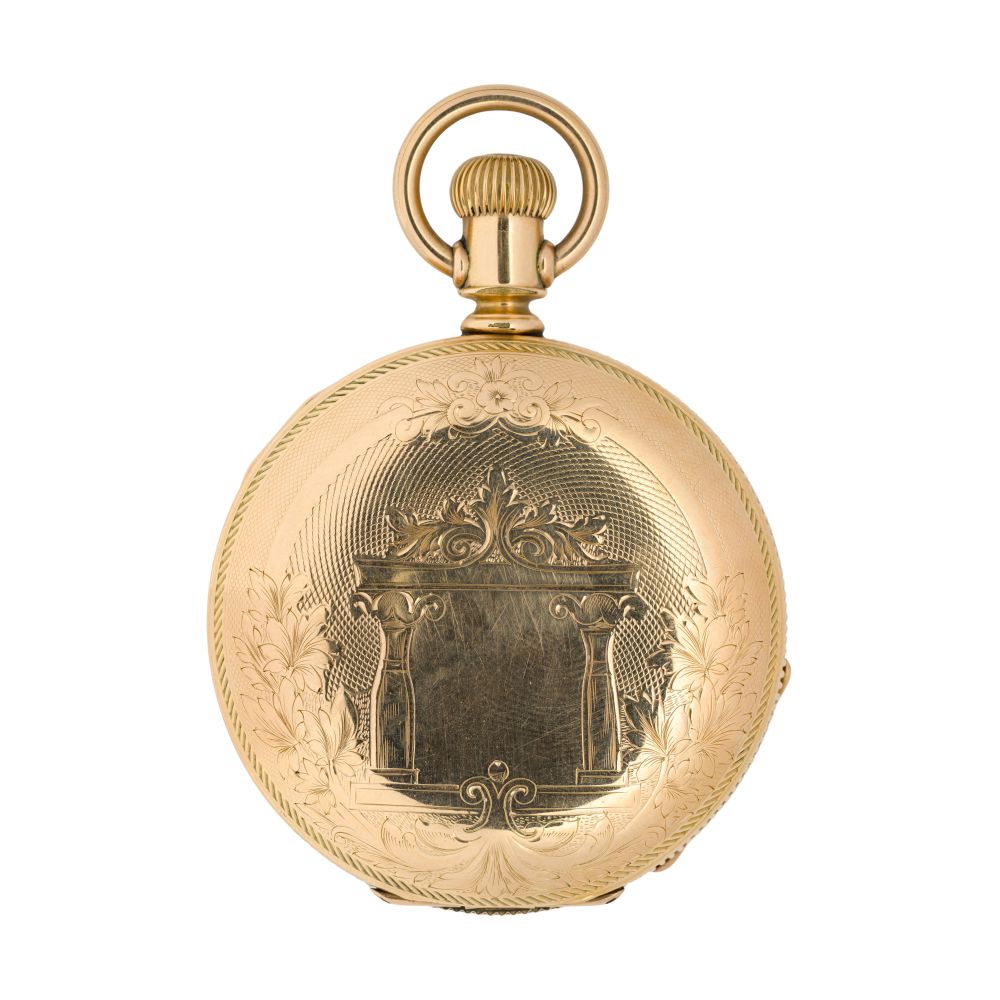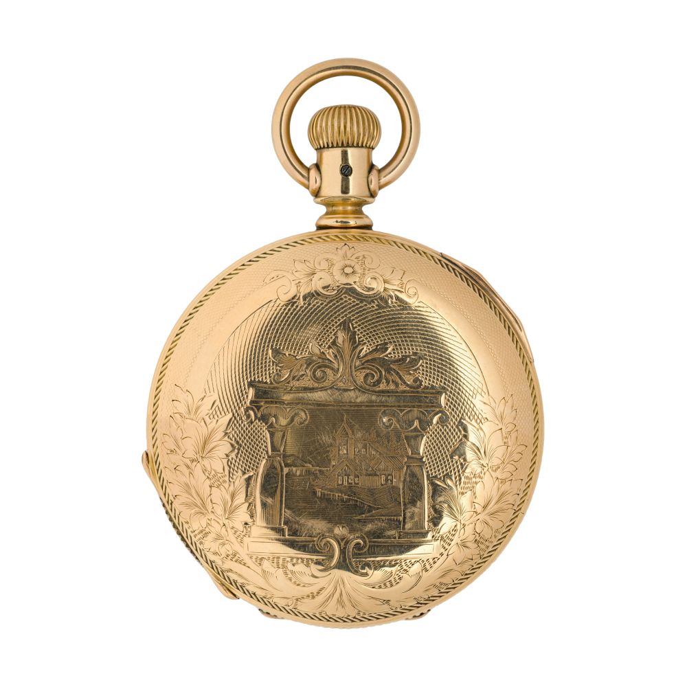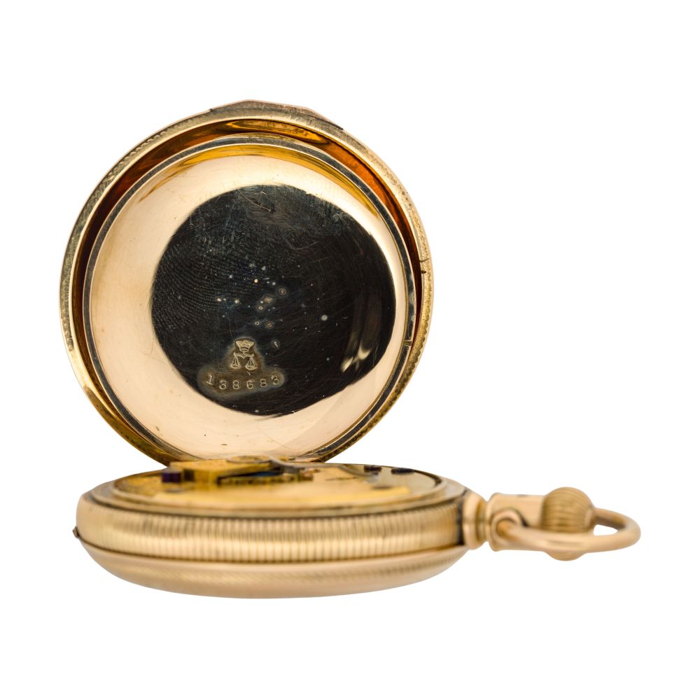 Serial #1055554 dating to c.1883, 15-jewel movement, No.80 grade, white dial having Roman numerals, blue hands, subsidiary dial for seconds, stem wind, lever set