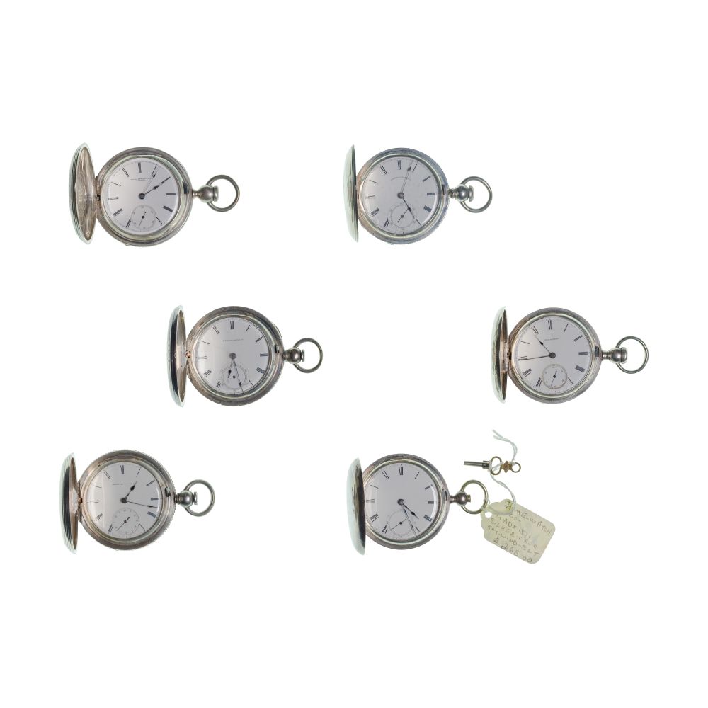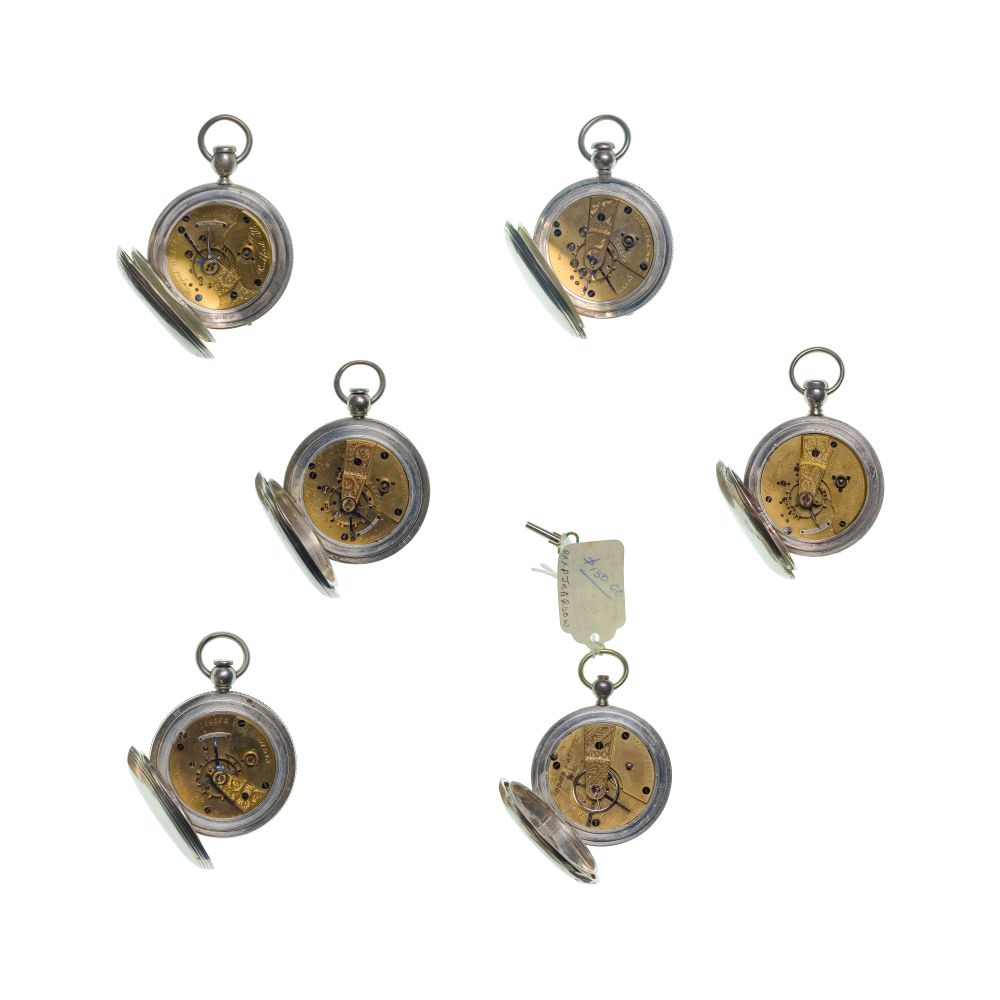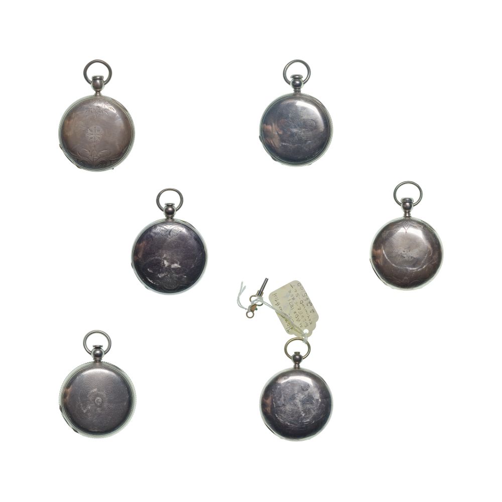 Condition: overall light to moderate wear consistent with normal use, some tarnish and scratches overall, all having stamped engravings, an American having a discolored crack on face, key wind running when tested, all others not running when tested, overall light to moderate wear consistent with normal use, some tarnish and scratches overall, all having stamped engravings, an American having a discolored crack on face, key wind running when tested, all others not running when tested