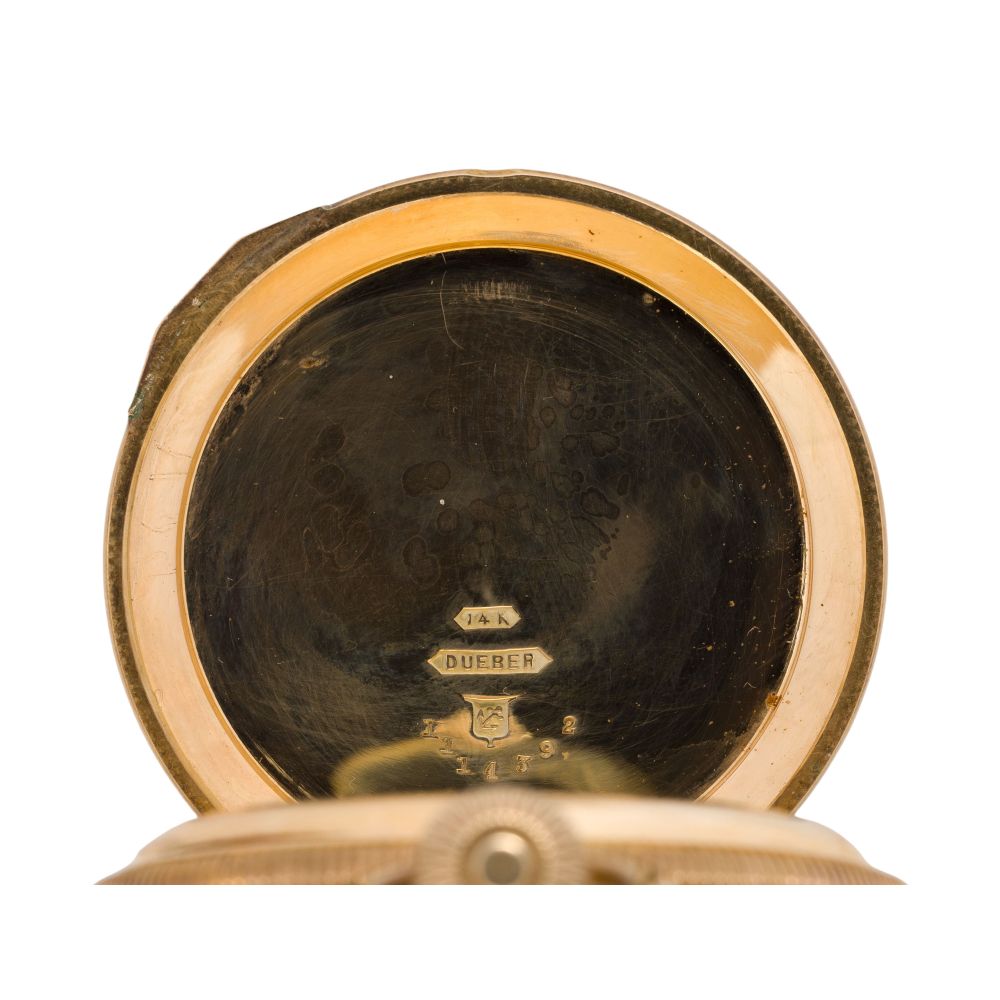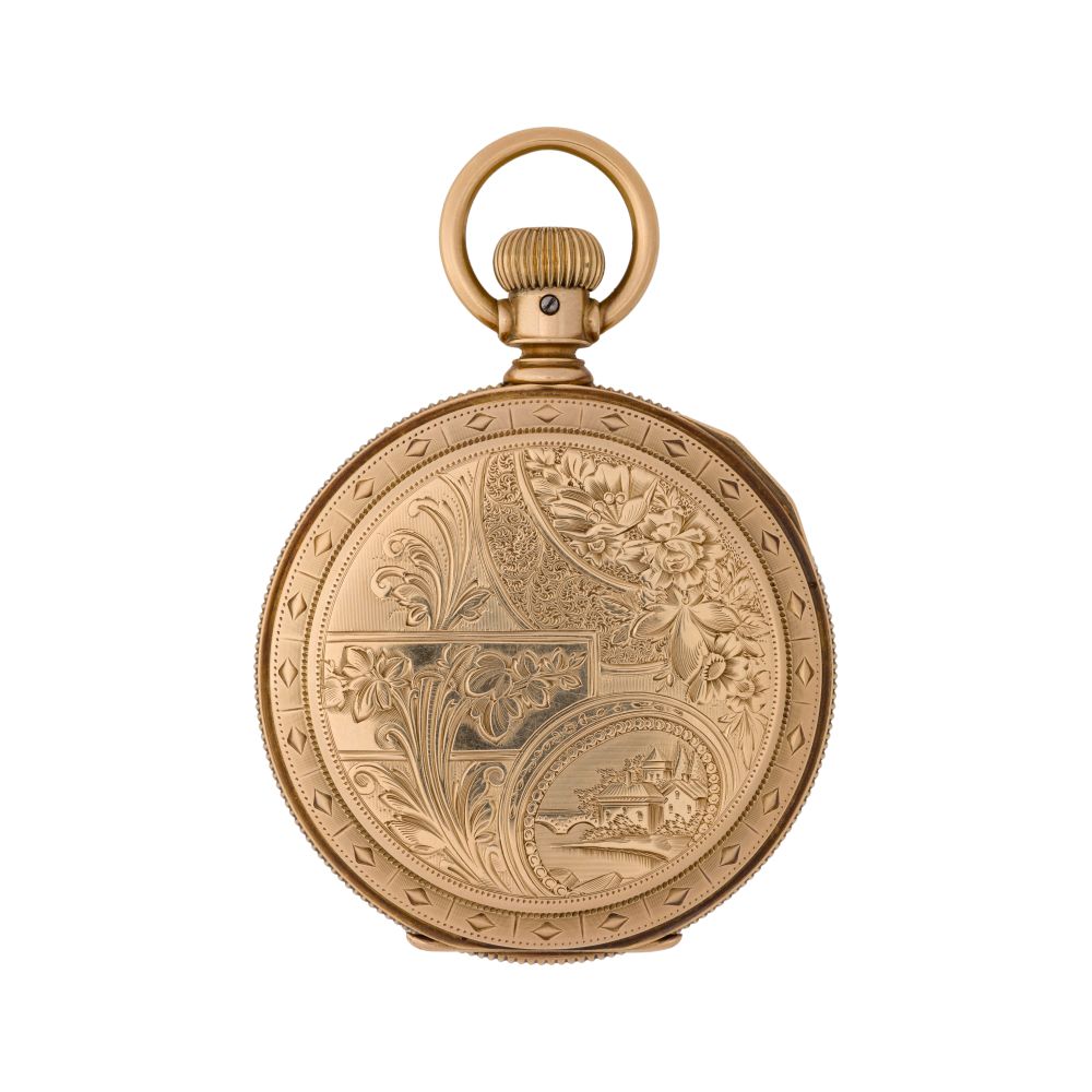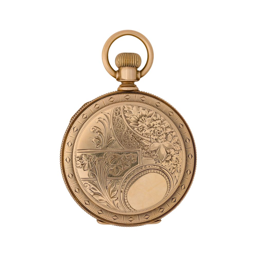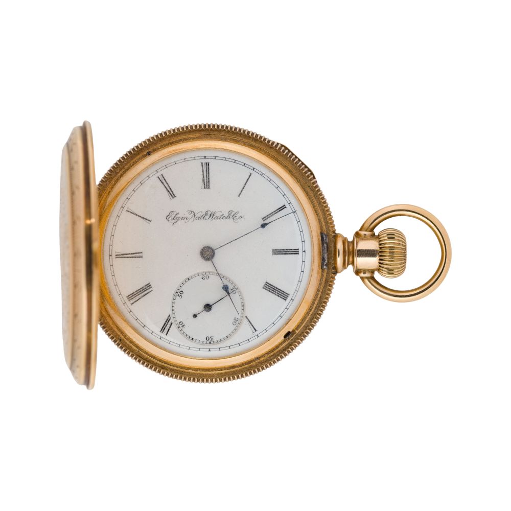 Serial #2048422 dating to c.1887, 13-jewel movement, No.2 grade, white dial having Roman numerals, blue hands, subsidiary dial for seconds, stem wind, lever set (marked “14k” inside of back and front of case)