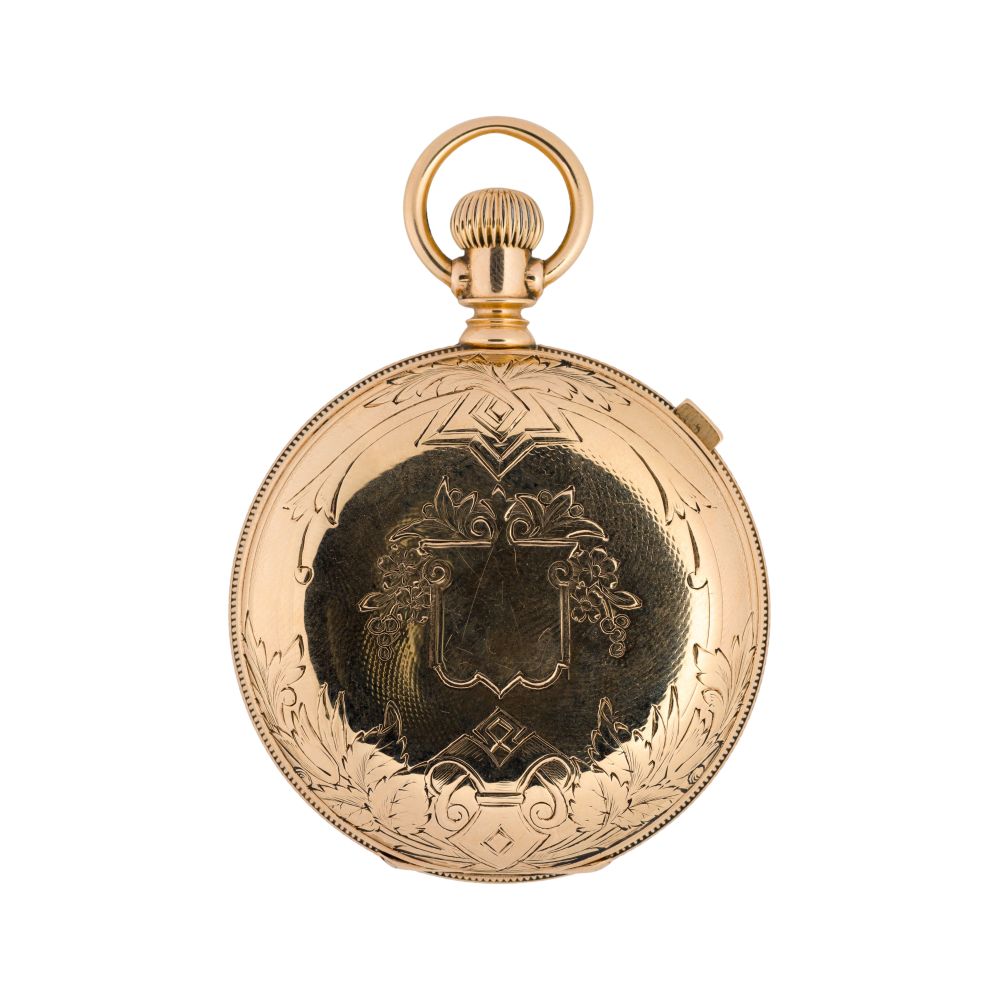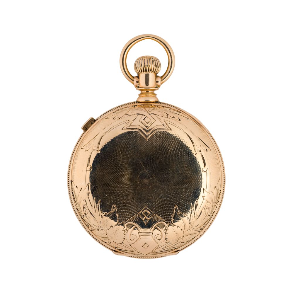 Serial #2719758 dating to c.1886, 13-jewel movement, riverside grade, white dial having Roman numerals, blue hands, subsidiary dial for seconds, stem wind, lever set (marked “14k” inside case and inside dust cover)