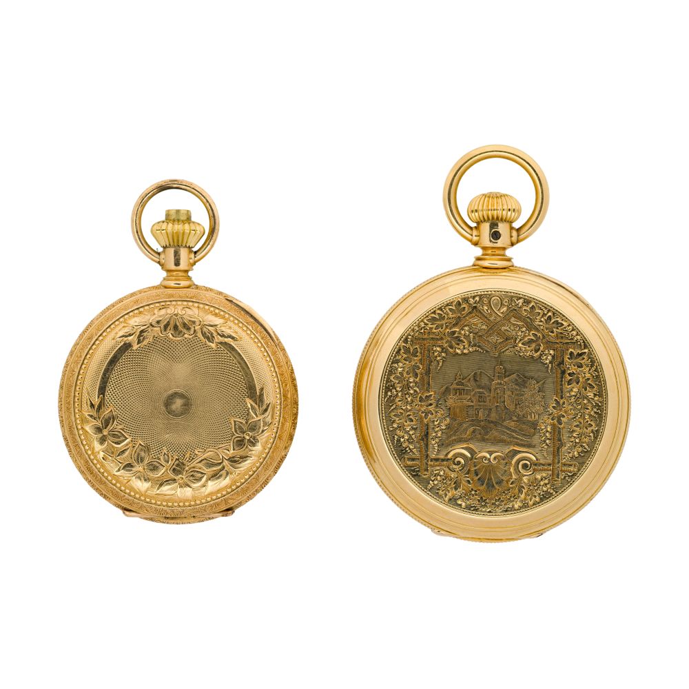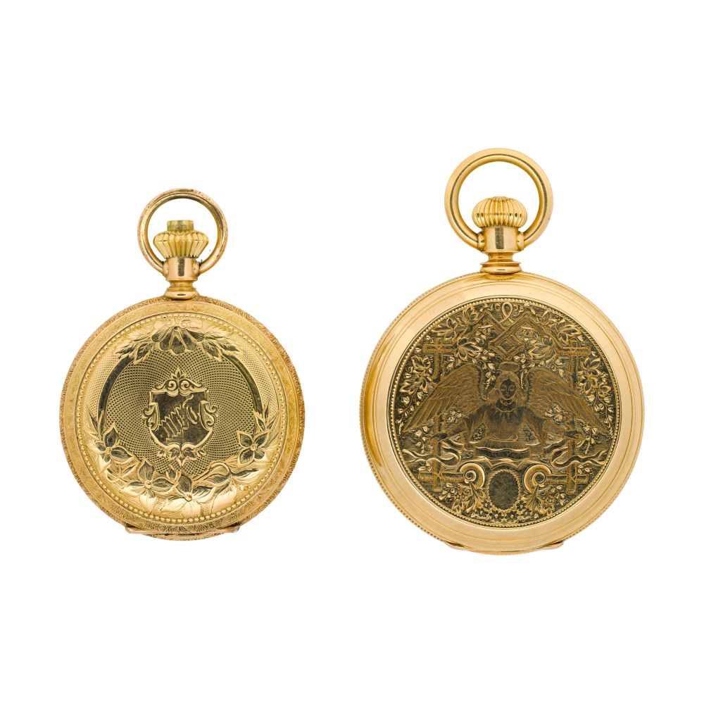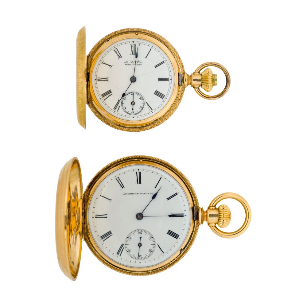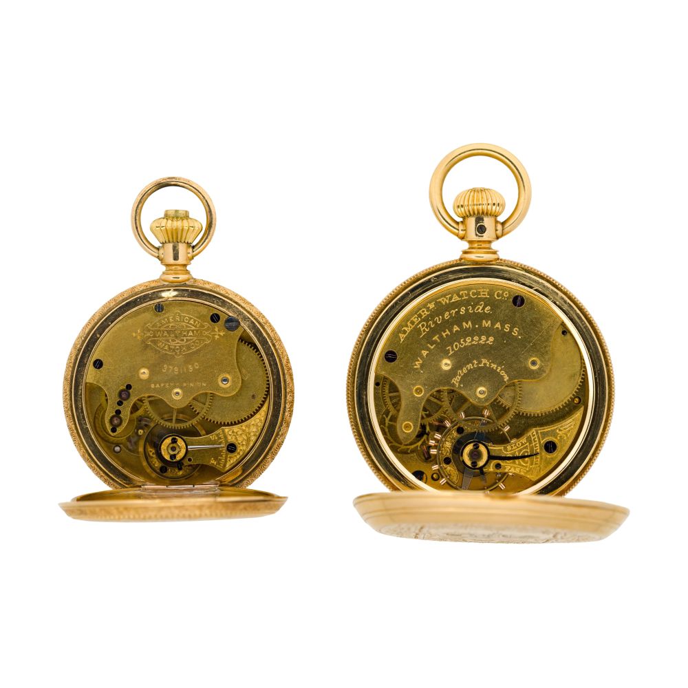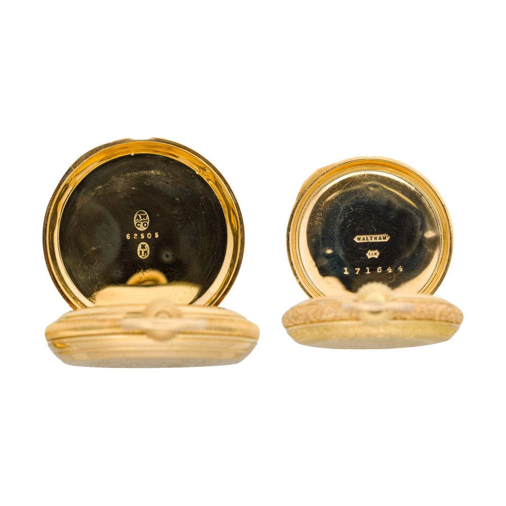 (2) items including serial #1052222 dating to c.1878, 7-jewel movement, riverside grade, white dial having Roman numerals, blue hands, subsidiary dial for seconds, stem wind, lever set (marked “K18 / 18K” inside case) and serial #37911650 dating to c.1889, 9-jewel movement, seaside grade, white dial having Roman numerals, blue hands, subsidiary dial for seconds, stem wind, lever set (marked “18k” inside case)