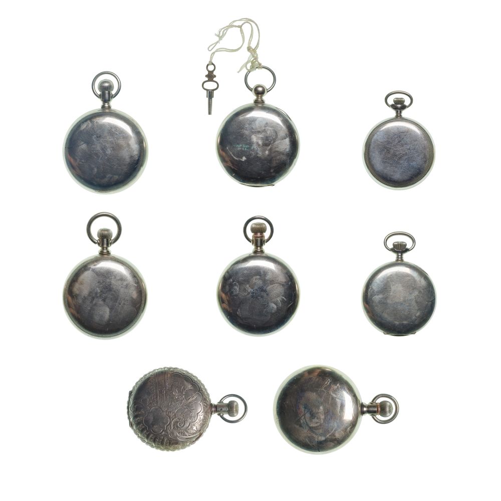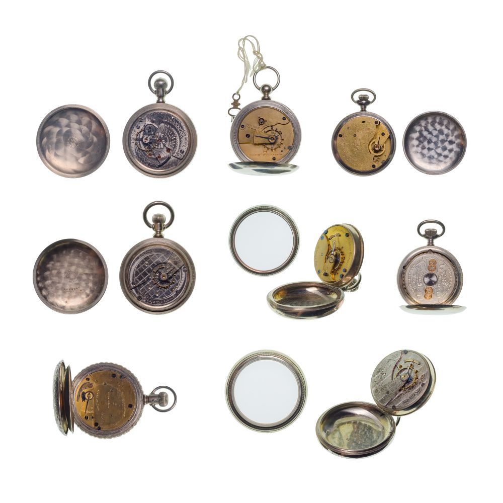(8) items including a Waltham serial #11785172, a Waltham serial #1,385410, a Elberon serial #110761, a Hamilton serial #132574, a Trenton Watch Co. serial #433446, an Aurora Watch Co. serial #119627, a New England serial #486704 and a Hebdomas 8-day movement having no serial number
