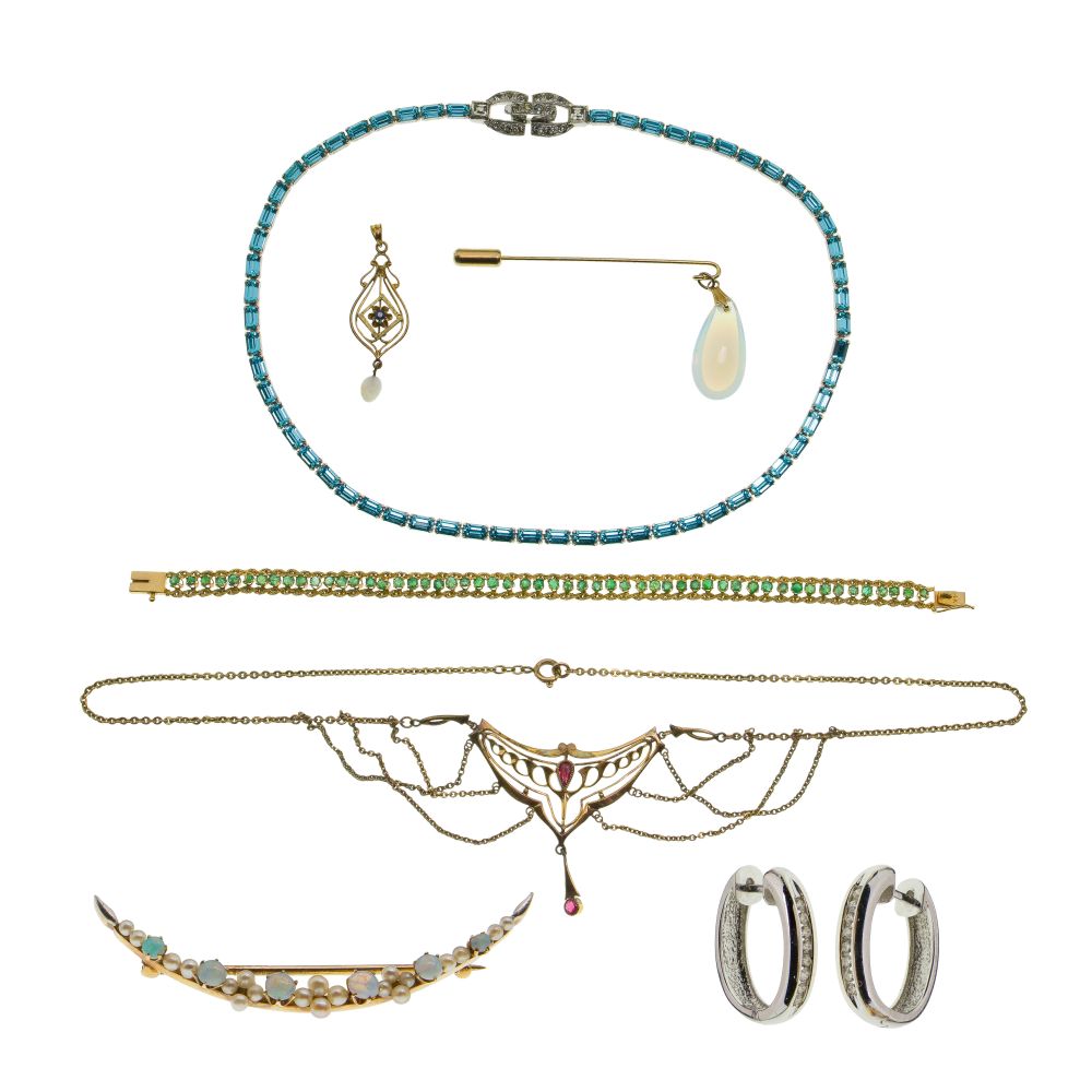 (3) items including an emerald tennis style bracelet, a pair of hoop style pierced earrings and a pearl and opal crescent moon shaped pin (most marked “14k”) as well as a few pieces of fashion jewelry