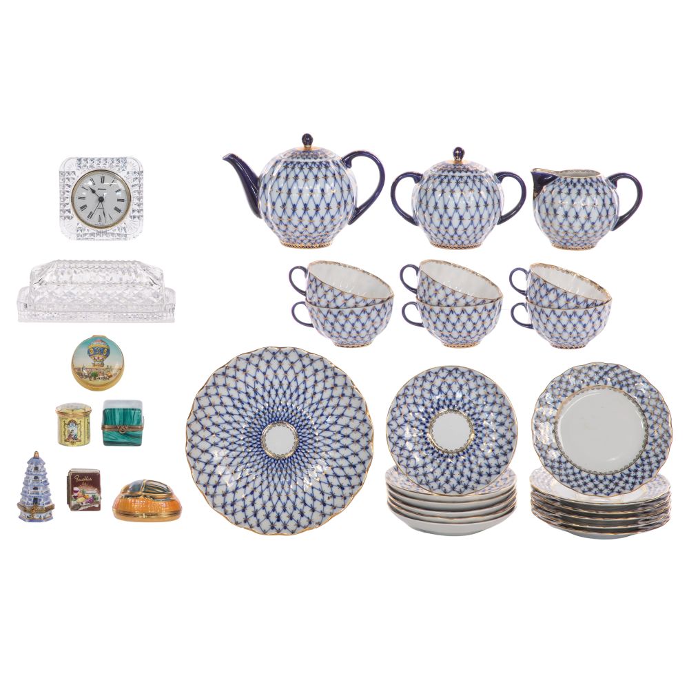 (30) total pieces including the (22)-piece porcelain set comprising a teapot, a creamer, a covered sugar, (6) cups, (6) saucers, (6) six-inch plates and a serving bowl, all having maker mark and “Made in USSR” underside; together with (6) trinket boxes including (3) Limoges, (2) Halcyon Days and an unmarked as well as a Staiger crystal case quartz desk clock and an unmarked pressed glass covered butter dish