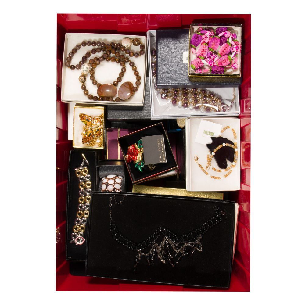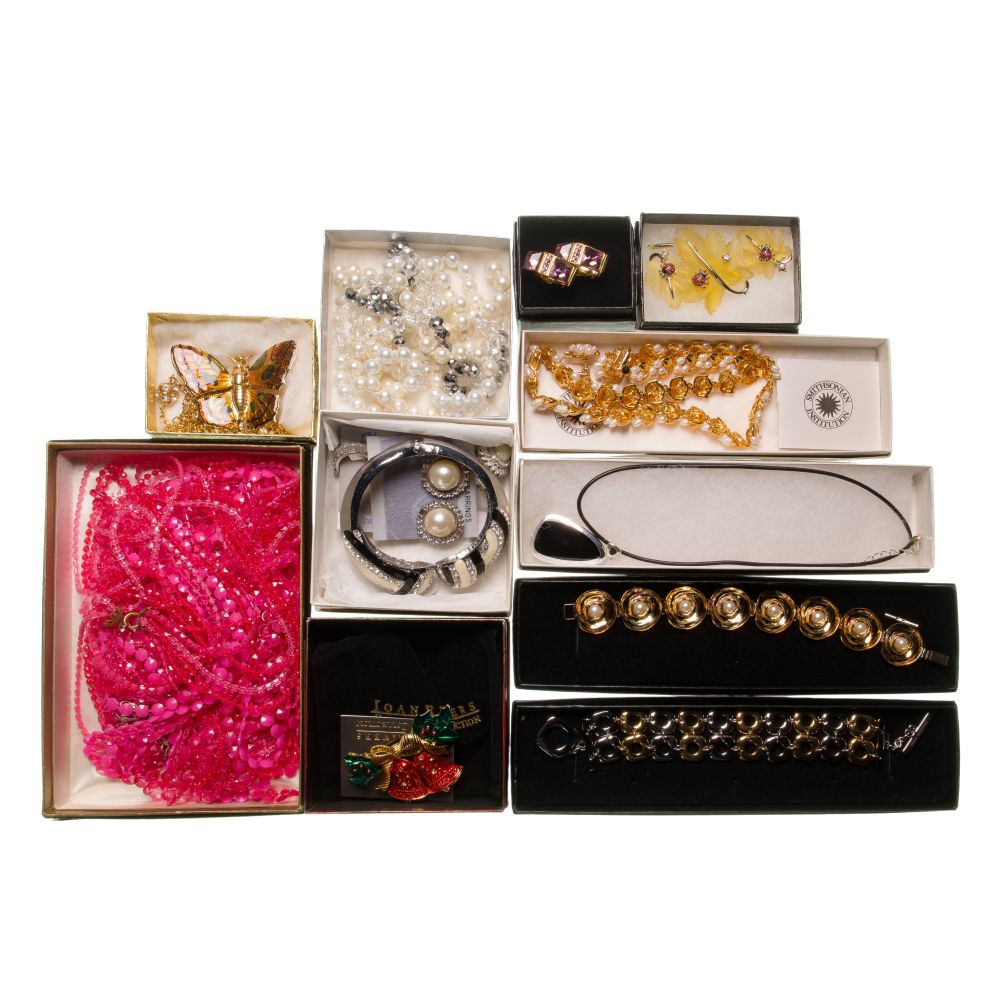 Approximately (60) boxed / cased items from makers including Liz Claiborne, Monet, De Mars, Lee Sands, Joan Rivers, Nolan Miller, Giovanni, Miss Mayfield and Louise Light, including suites and sets, necklaces, bracelets, earrings and brooches