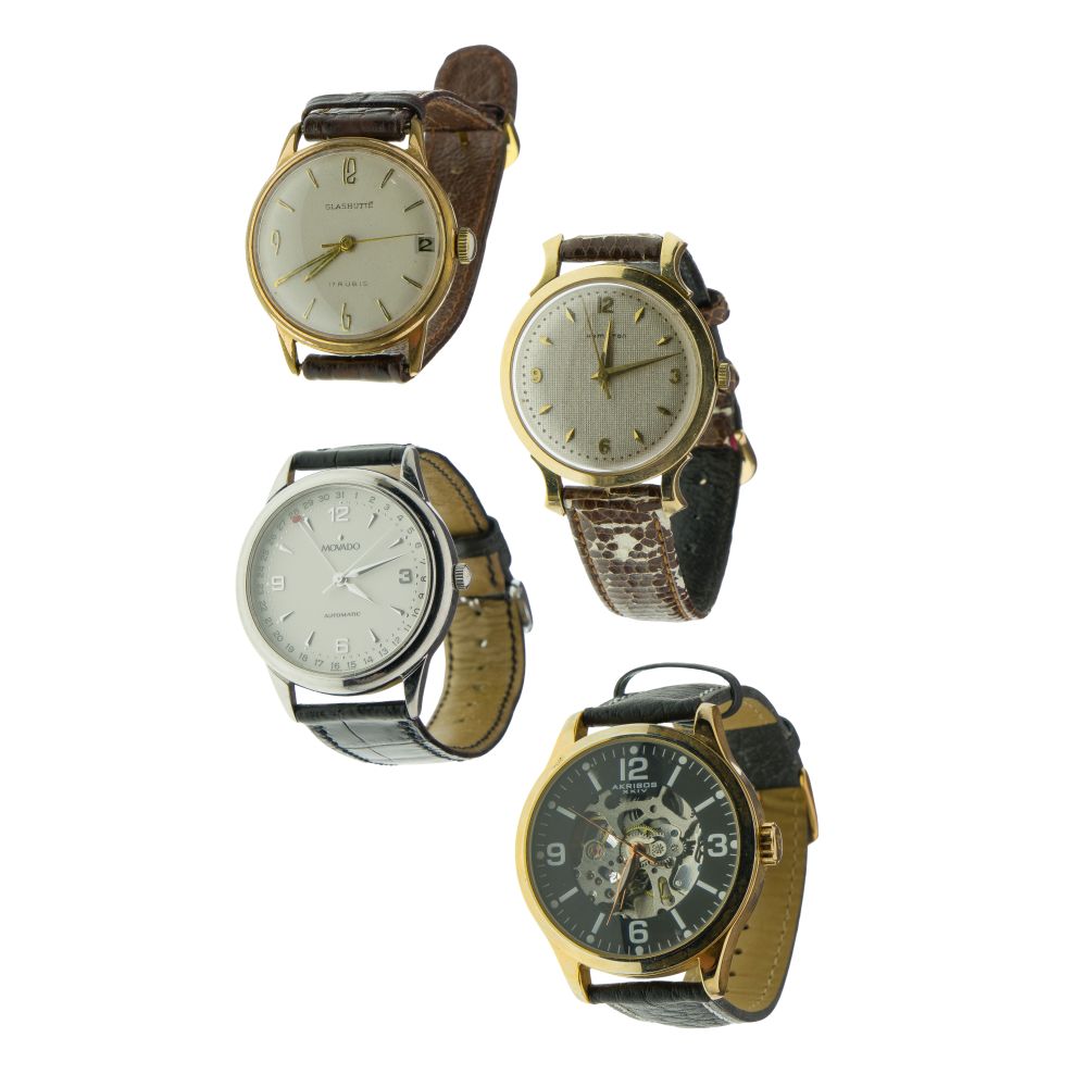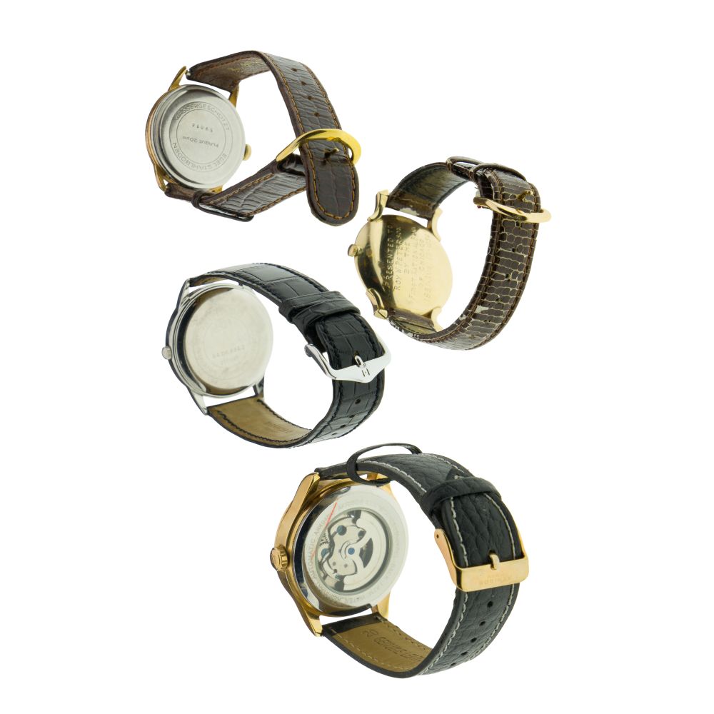 (4) total items including a Hamilton wristwatch having a champagne face, Arabic and baton numbers on leather strap (marked “10k”); together with a Movado, Acribos and Gashutte, all having leather bands