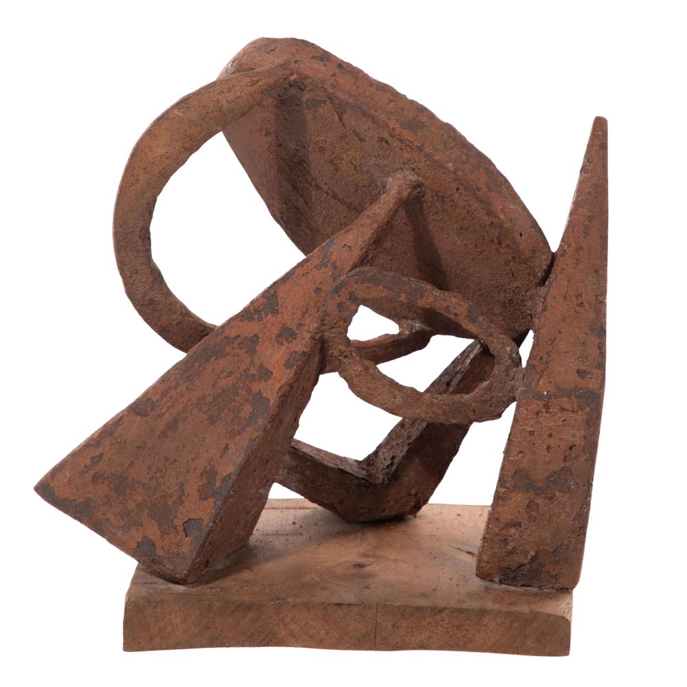 Undated, signed, depicting an abstract form on a wood plinth