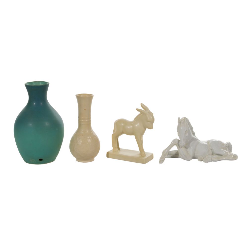 (4) items including a Rookwood #2389 vase, a Rookwood #6341 burro figurine, both having impressed marks underside, a Van Briggle lamp base / vase having a pre-form open bottom and cord hole to side next to impressed mark (hardware and cord removed but present and bagged); together with a Meissen recumbent horse figurine having a crossed swords mark underside