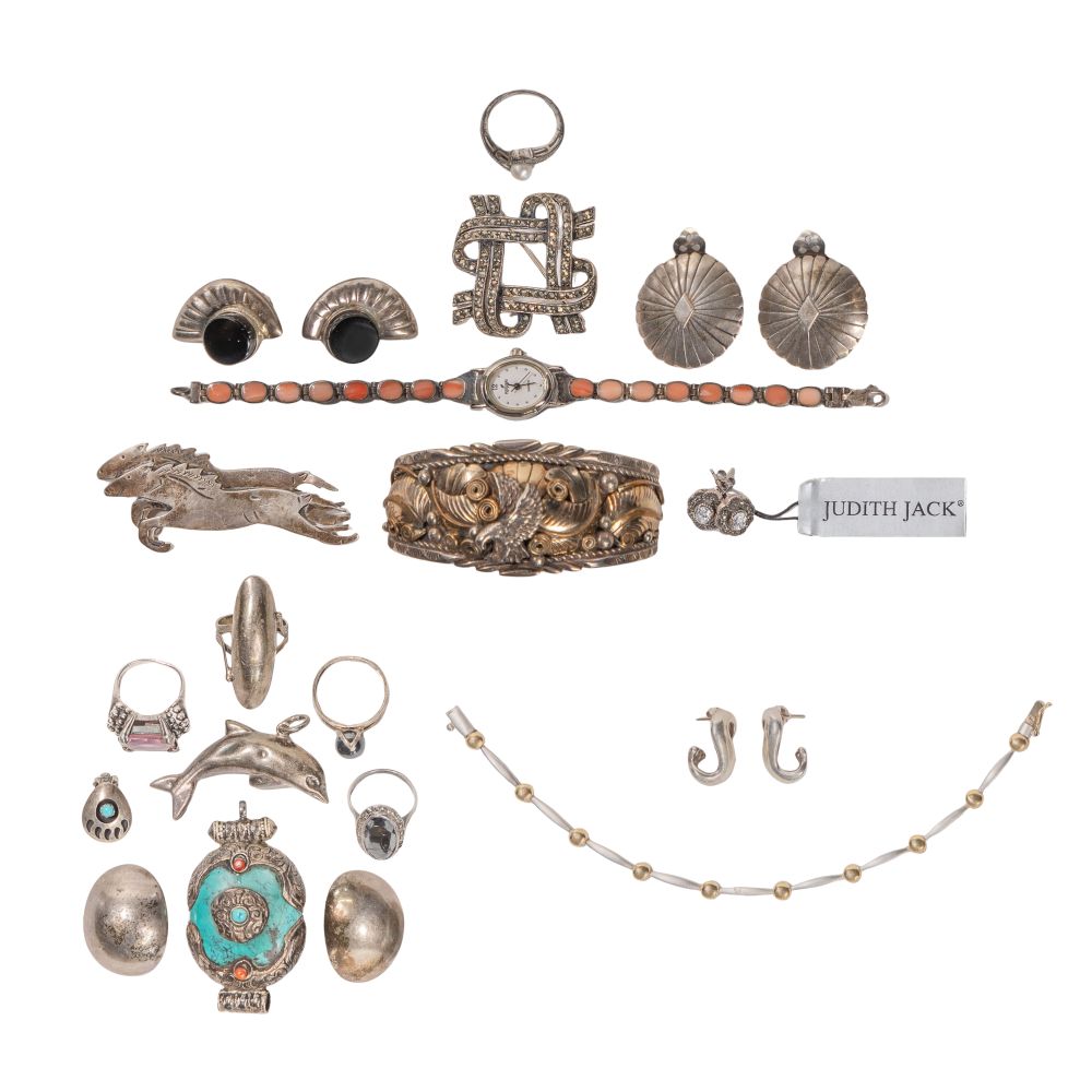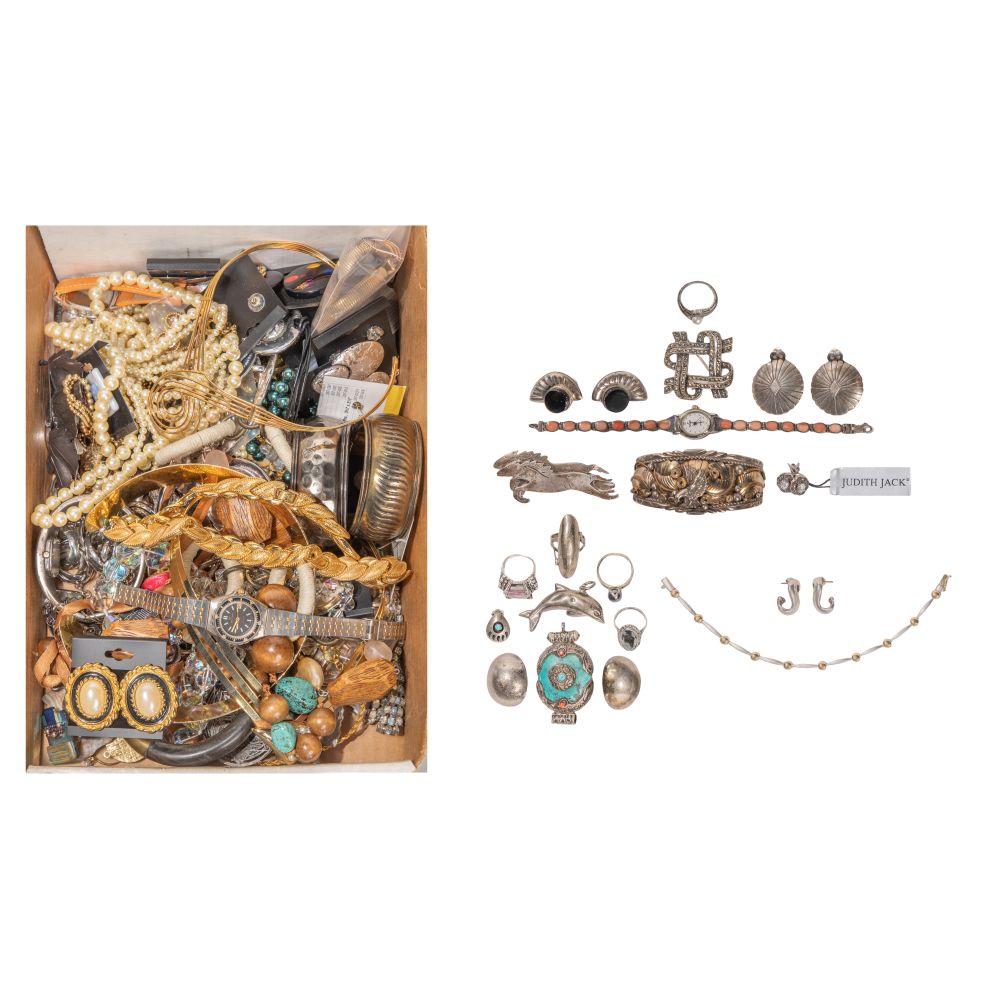 Including a two-tone white and yellow gold bracelet (marked “14k”), a pair of Tiffany & Co. infinity earrings, a cuff bracelet, pins, rings, earrings and wristwatch (most marked “sterling” / “925”) and approximately (5) pounds of costume jewelry necklaces, bracelets, rings, pins and earrings