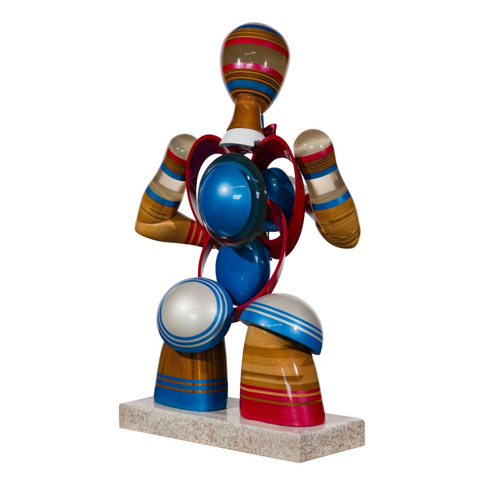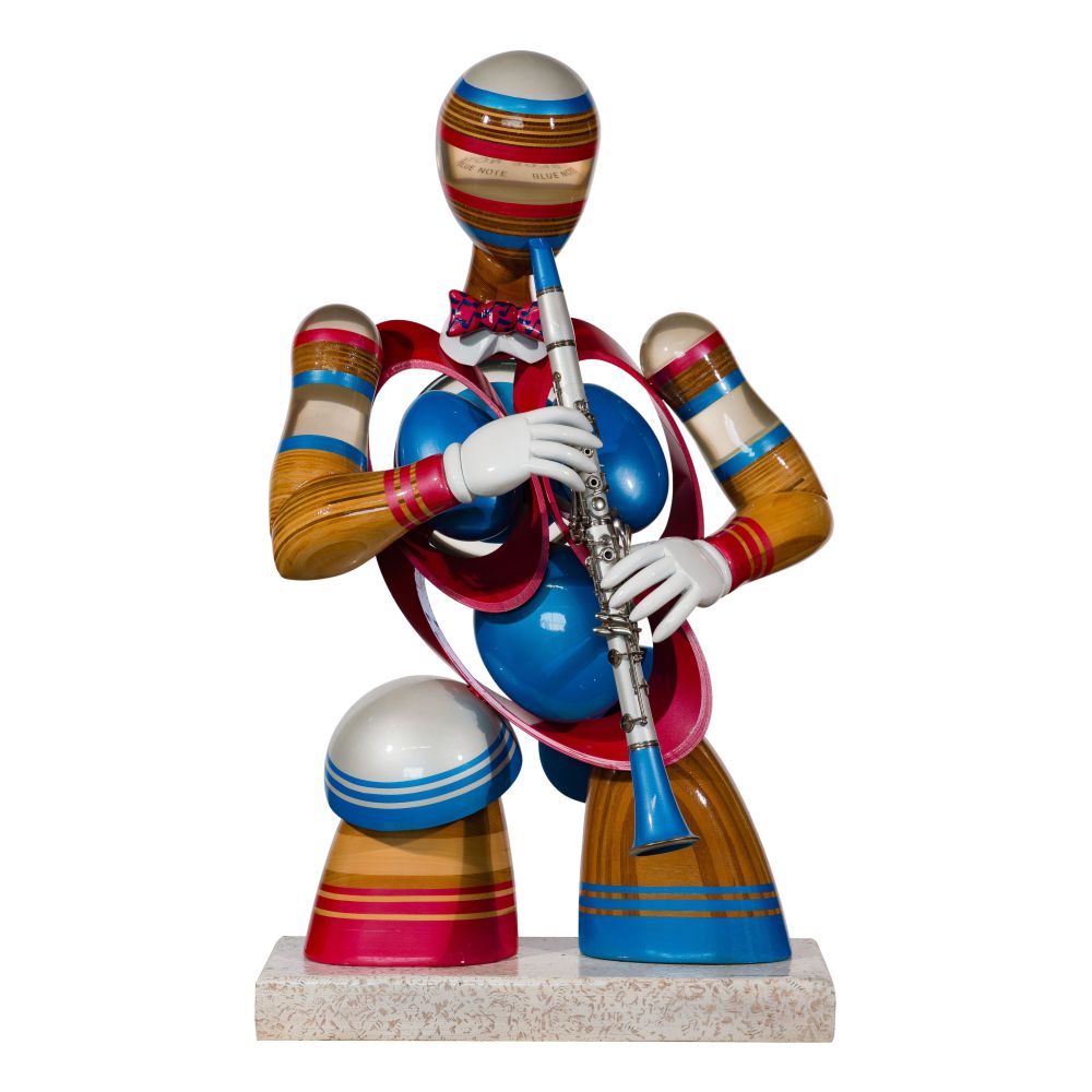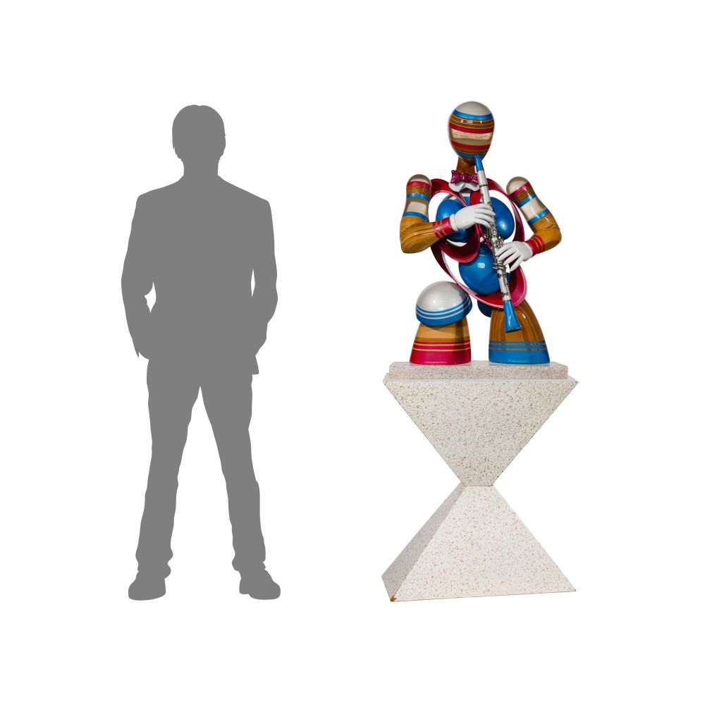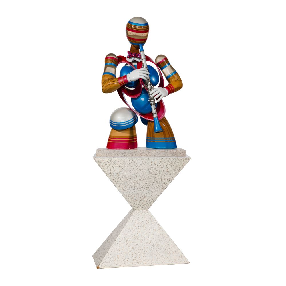 1993, signed, titled and dated on base, a clarinetist figure assembled from individually made wood and clear and color acrylic shapes having bands of multi-color paint and supported on a metal armature formed from three welded ovals, the title also visible in the clear acrylic band of head, on a white resin on wood base having a random pattern as well as a matching pedestal