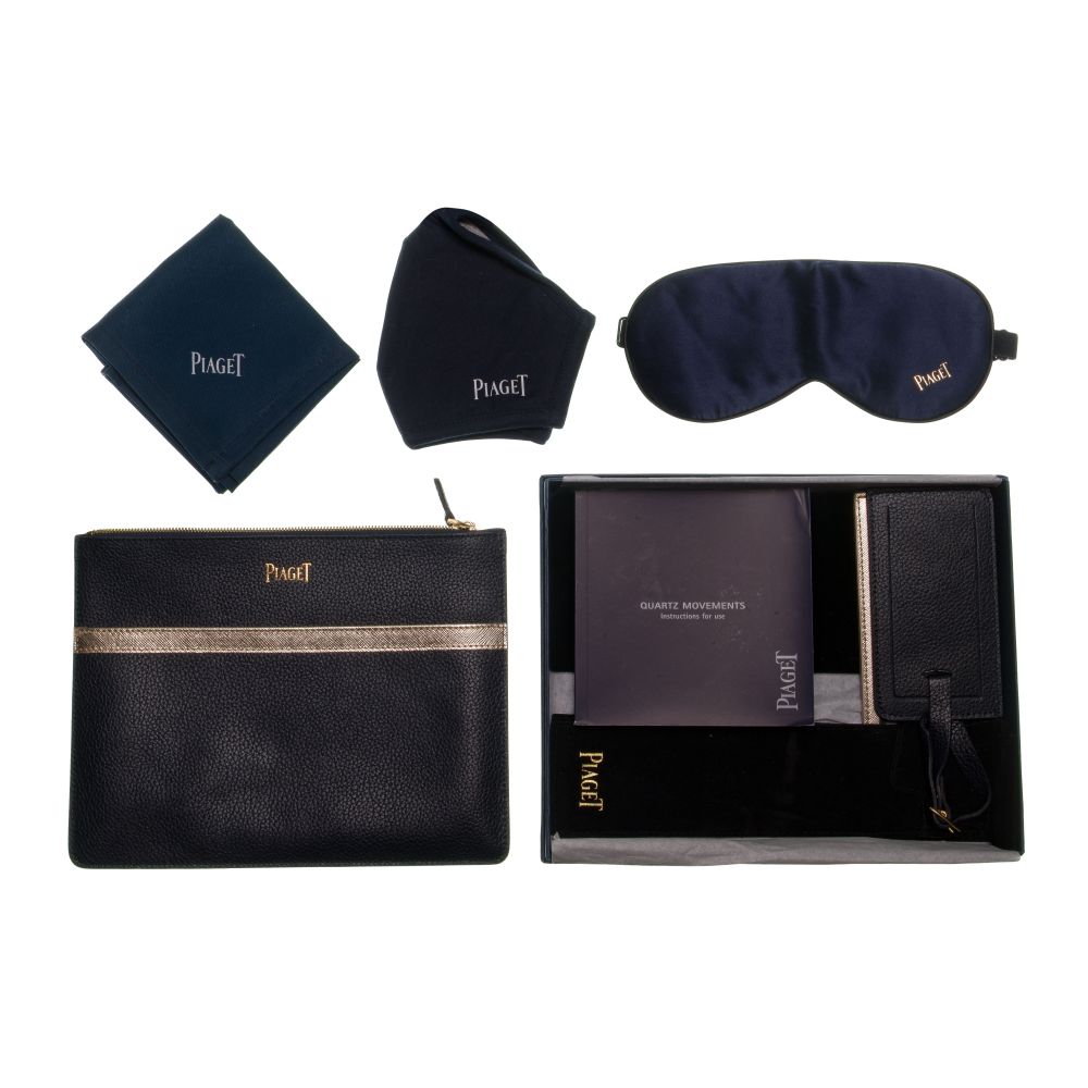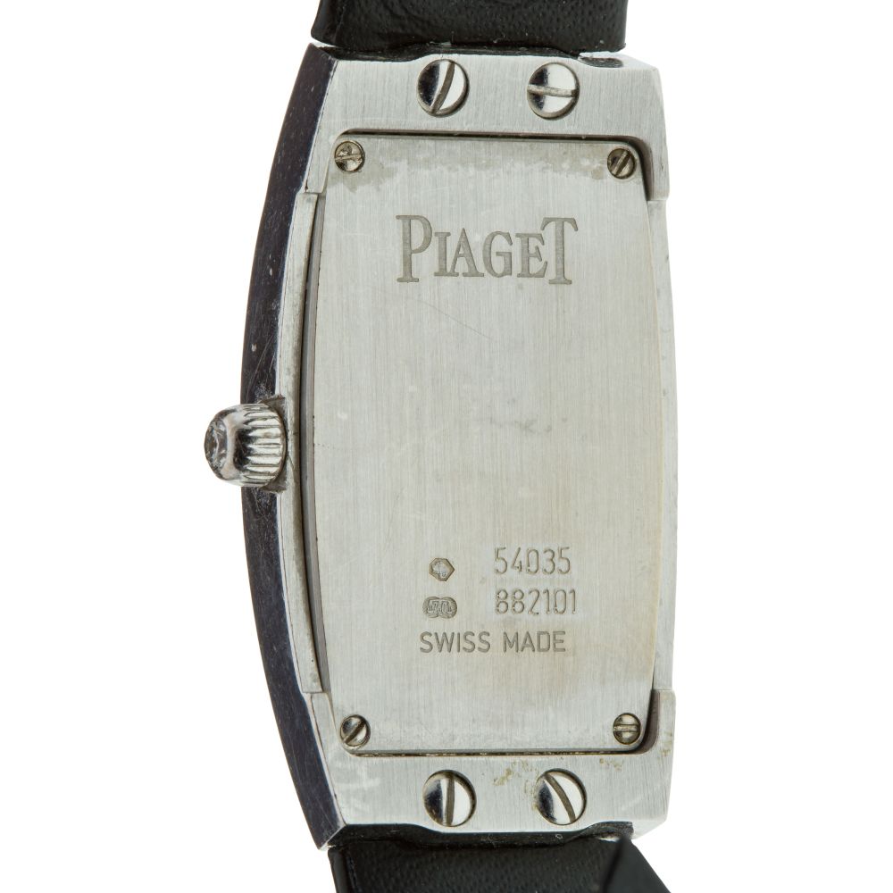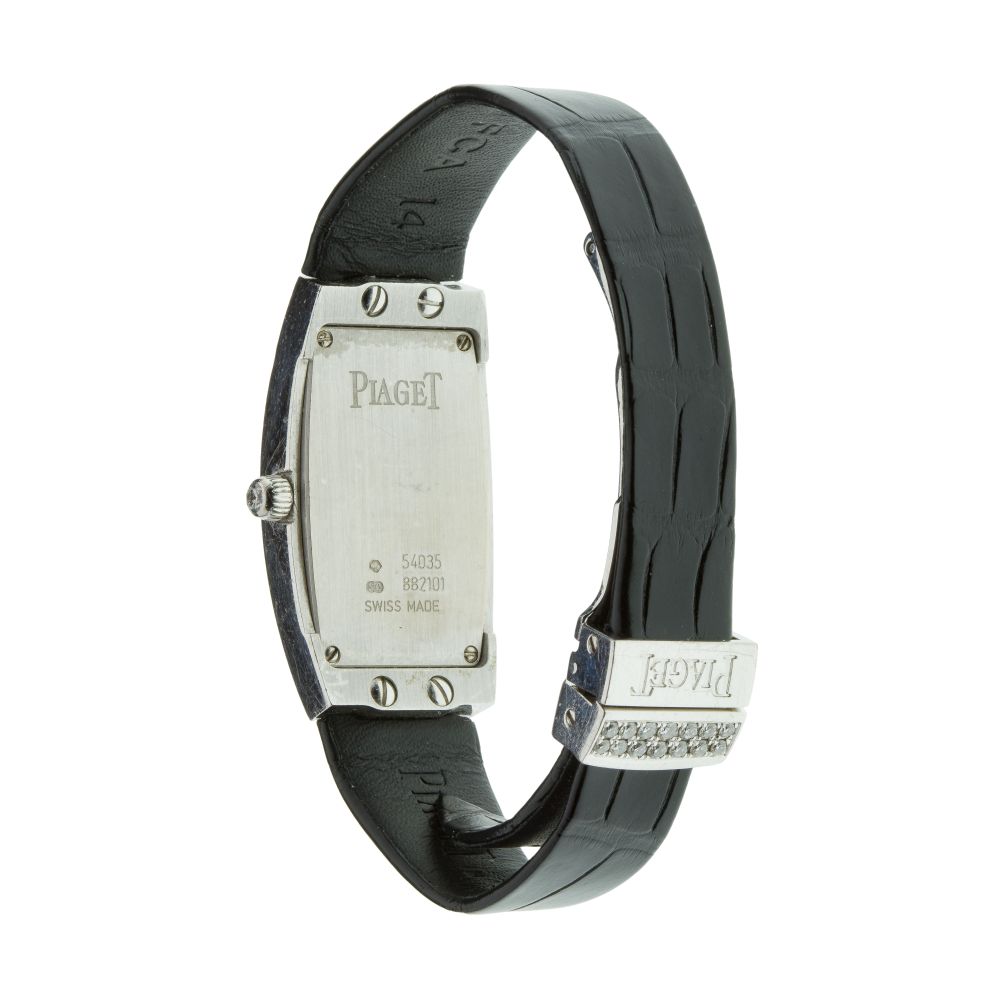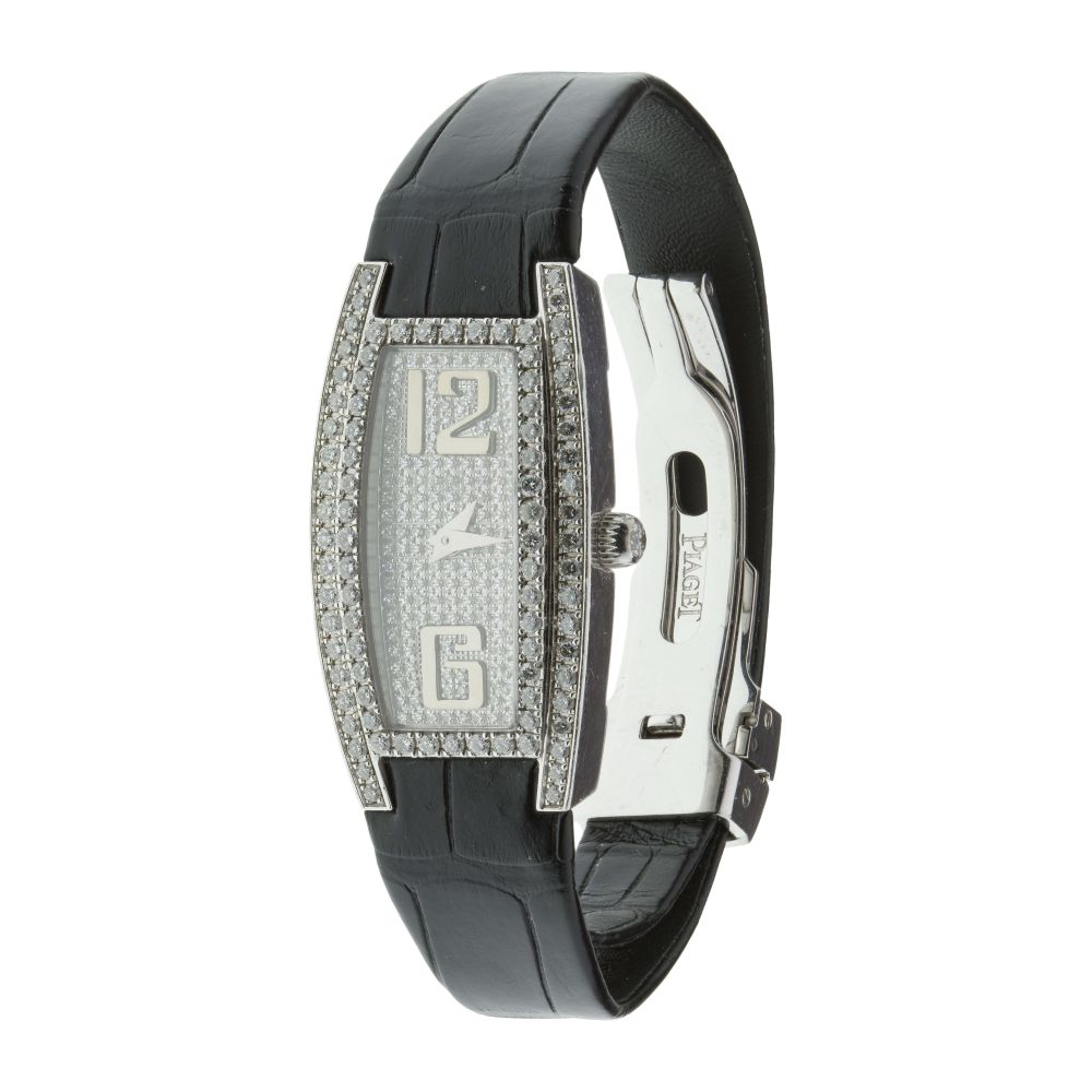 Serial #8822101, having a silvered dial accented with diamonds, 18k white gold-tone hour markers, caliber 690P quartz movement, black leather strap and diamond accented clasp (marked “750” on back of case and inside clasp), including COA, paperwork, a box of Piaget promotional items and a second strap