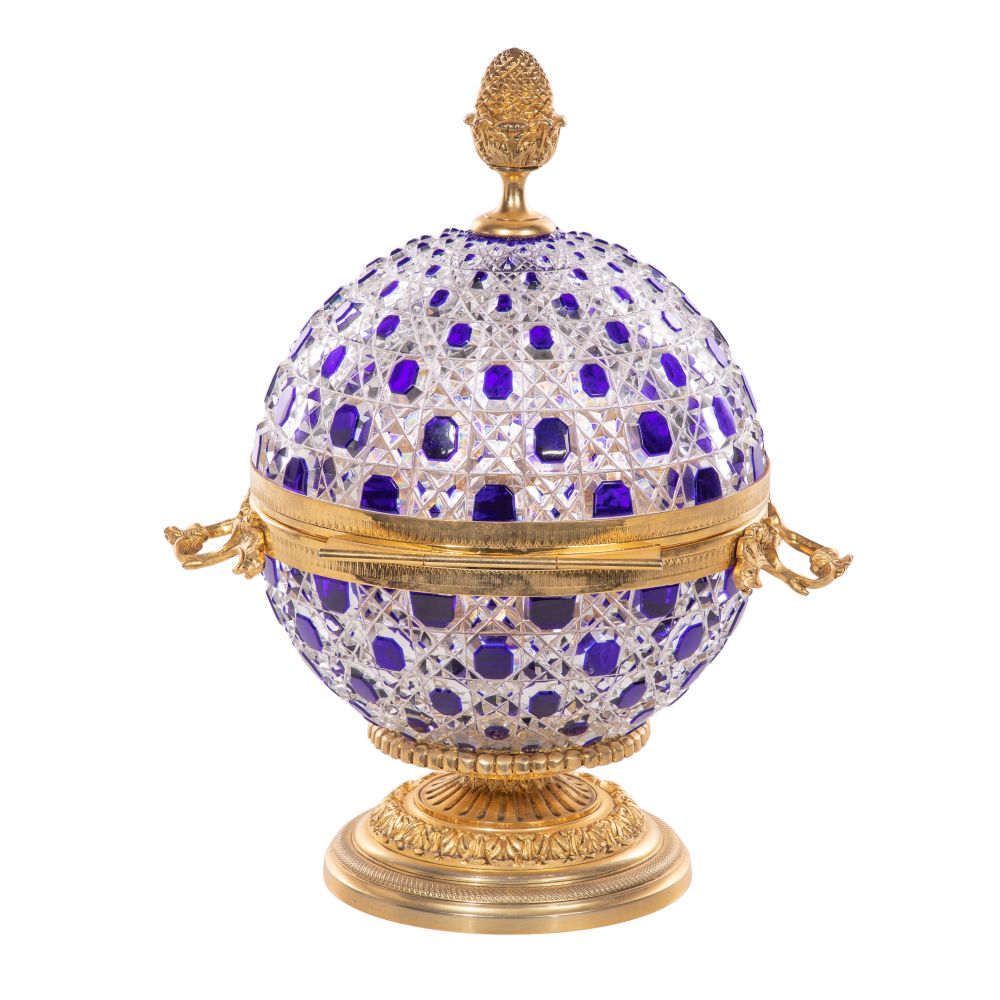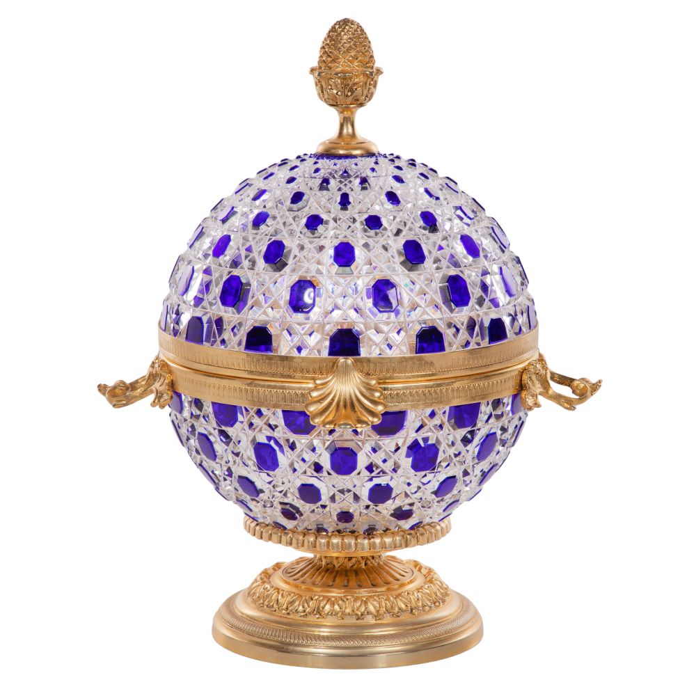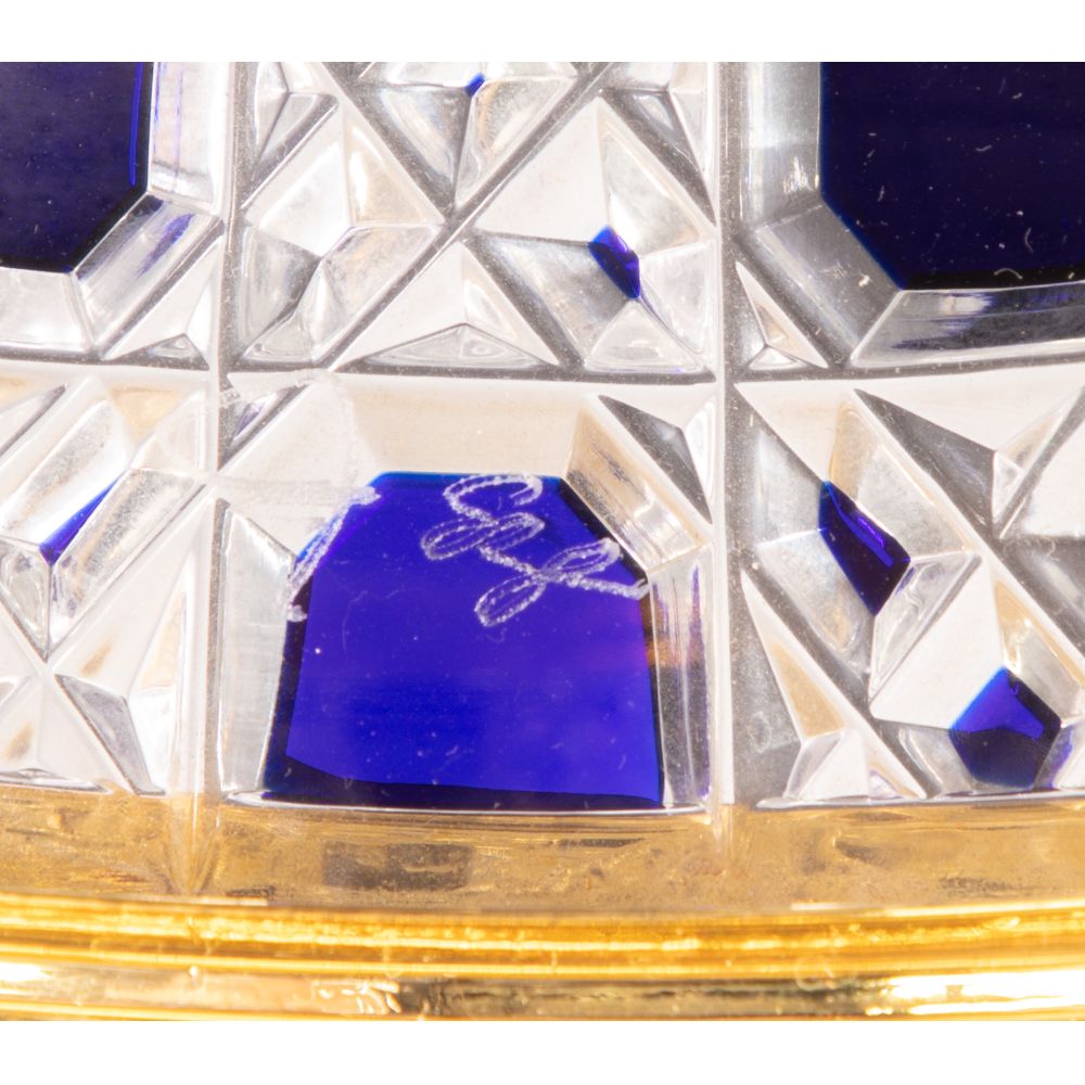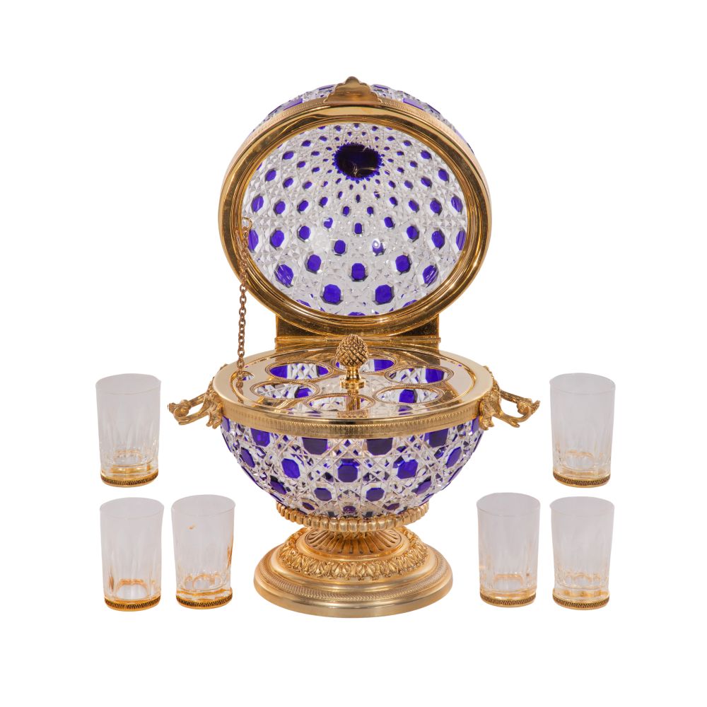 A French hinged bar having a diamond-shaped, cobalt cut to clear crystal globe form, gilt bronze ornamental footed base, rim, finial and handles as well as (6) glasses having gilt banded bottoms and holder on the interior, engraved signature inside lid and base