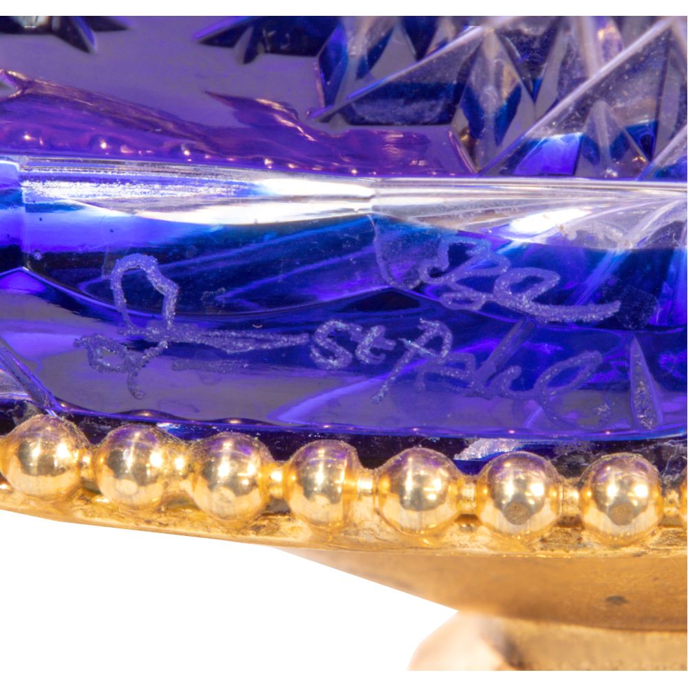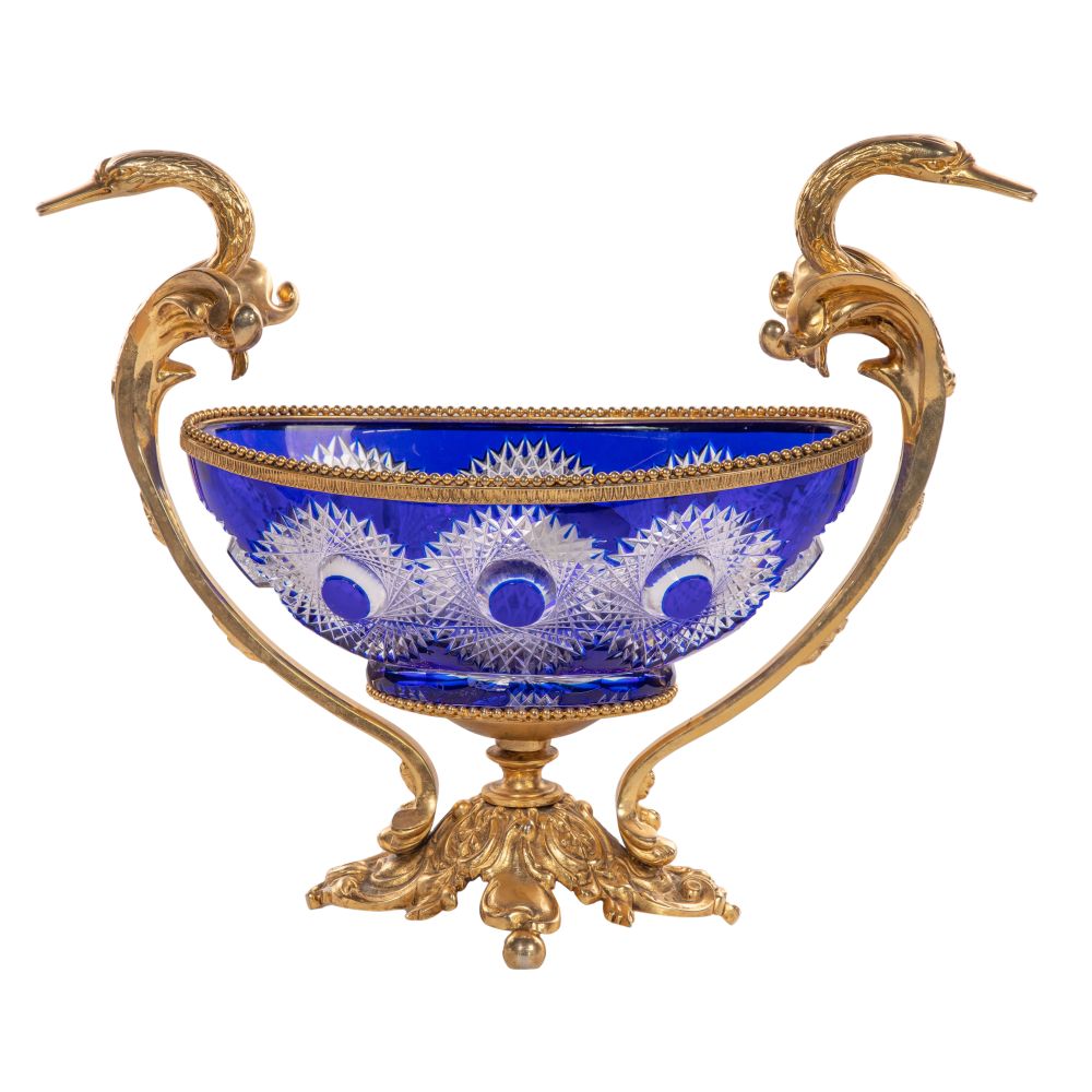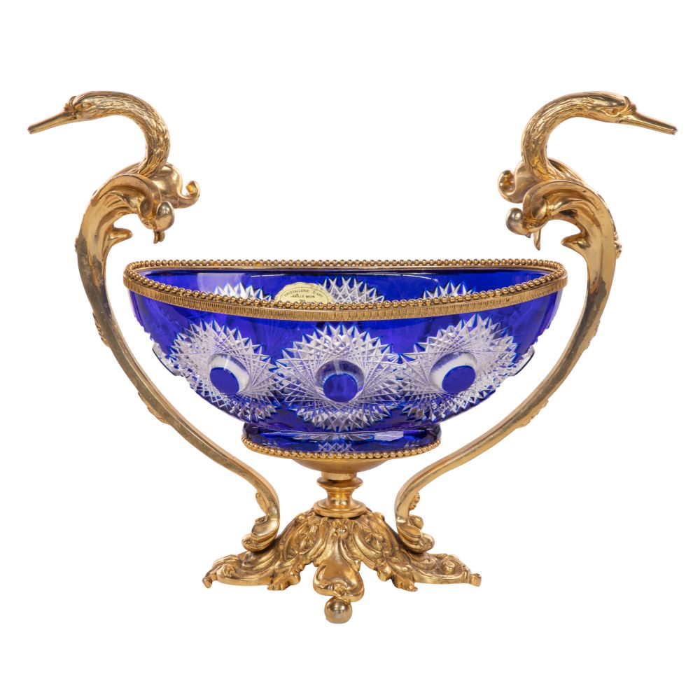 An oval, hand-cut cobalt-to-clear crystal bowl having gilt bronze dore mount of swans and Baroque scrolls, signed on outside lower rim and retaining original label