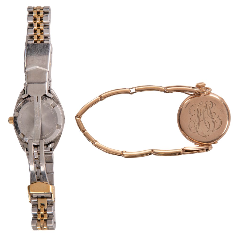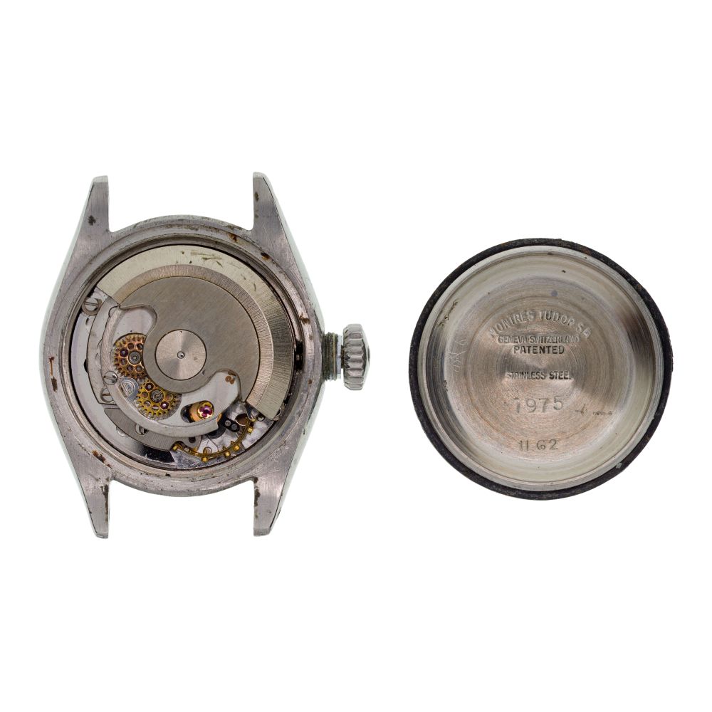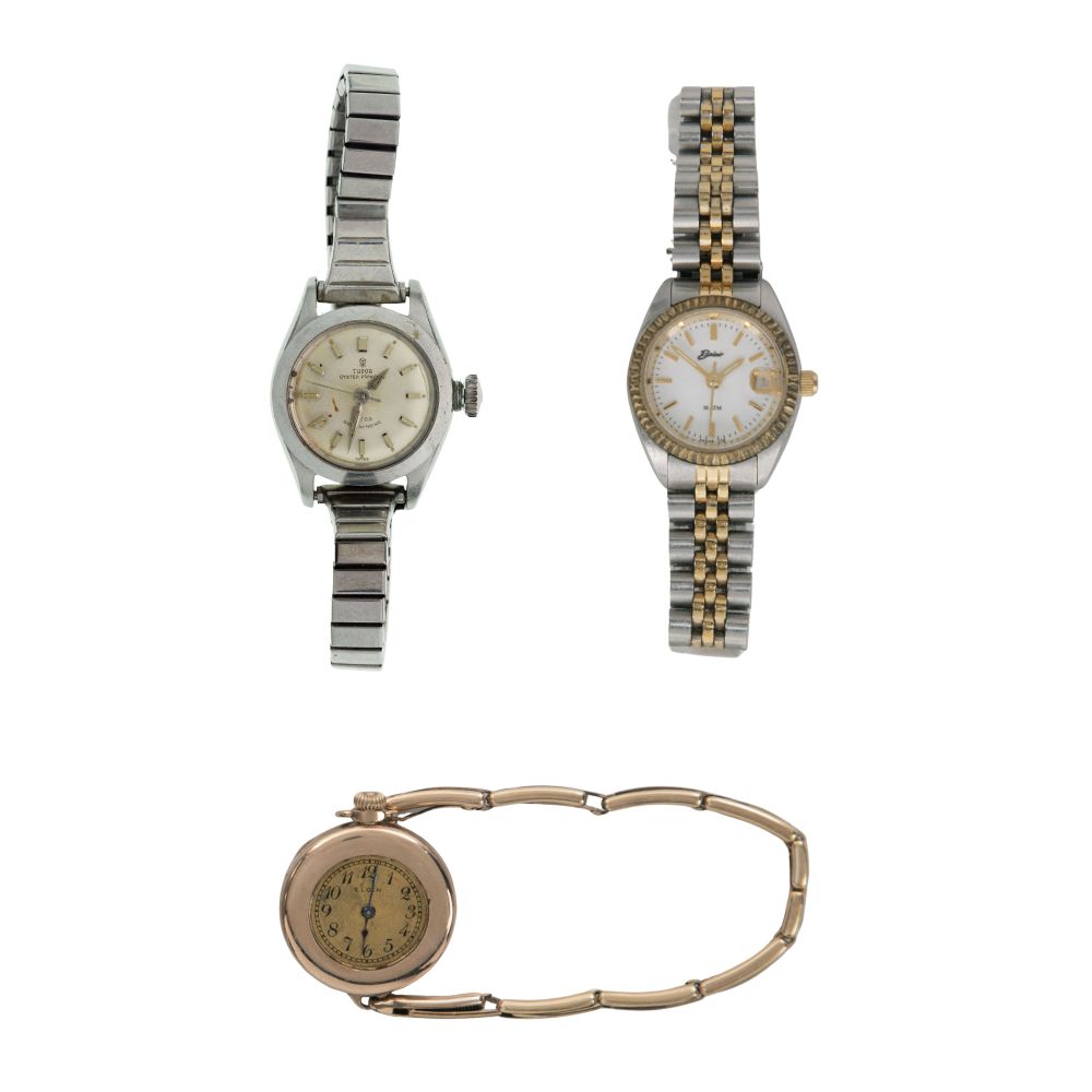 (3) total items including Tudor serial #370023, ref #7975, self-winding, silvered dial, raised indices, screwed down Rolex case in stainless steel, Rolex rivet-oyster bracelet, case marked Rolex; together with a fashion Elgin and a Bolair wristwatches