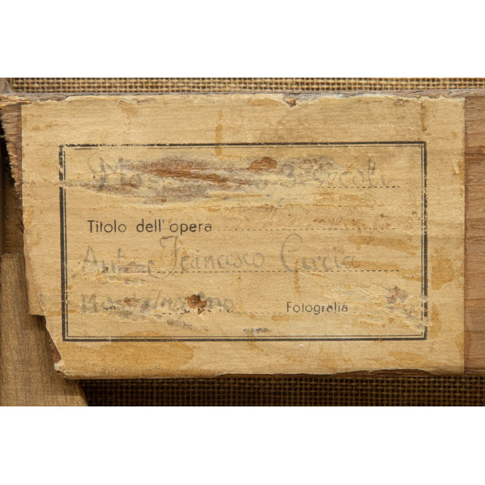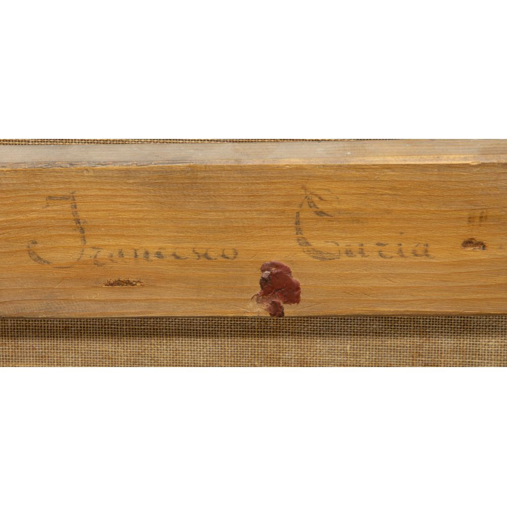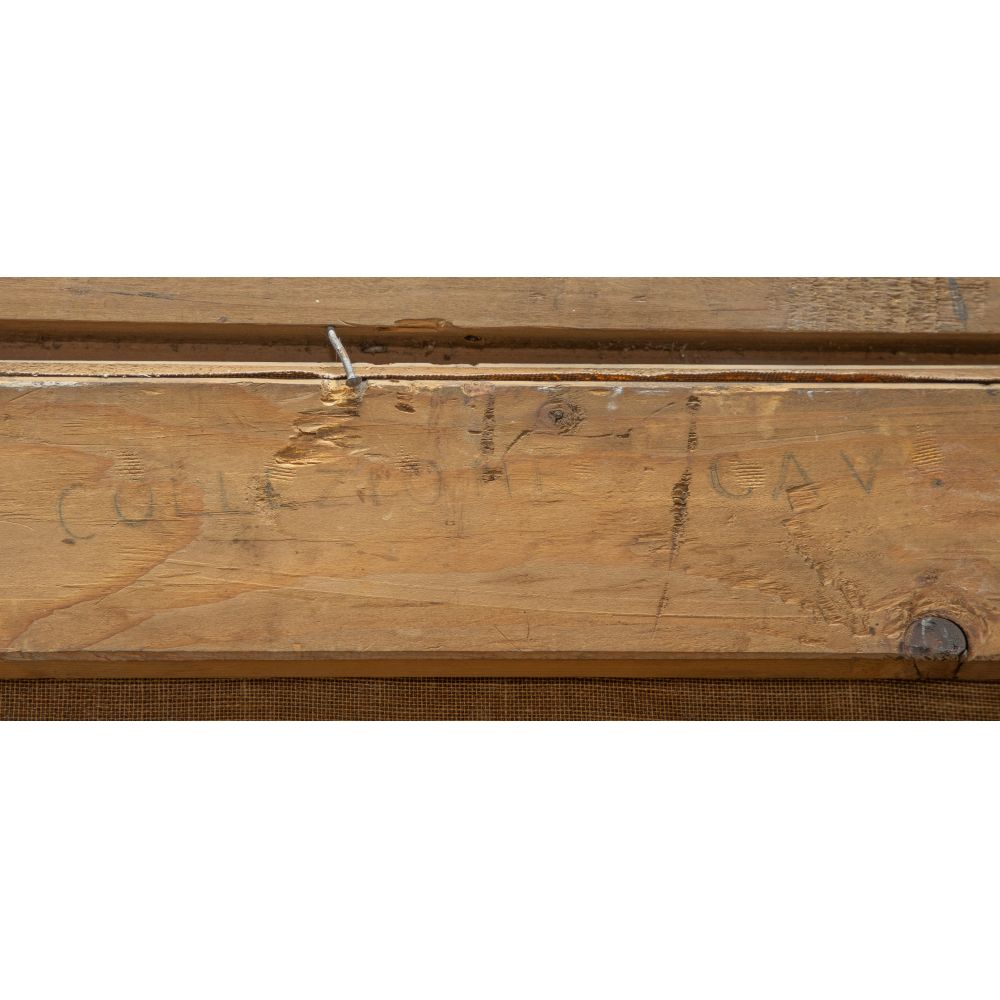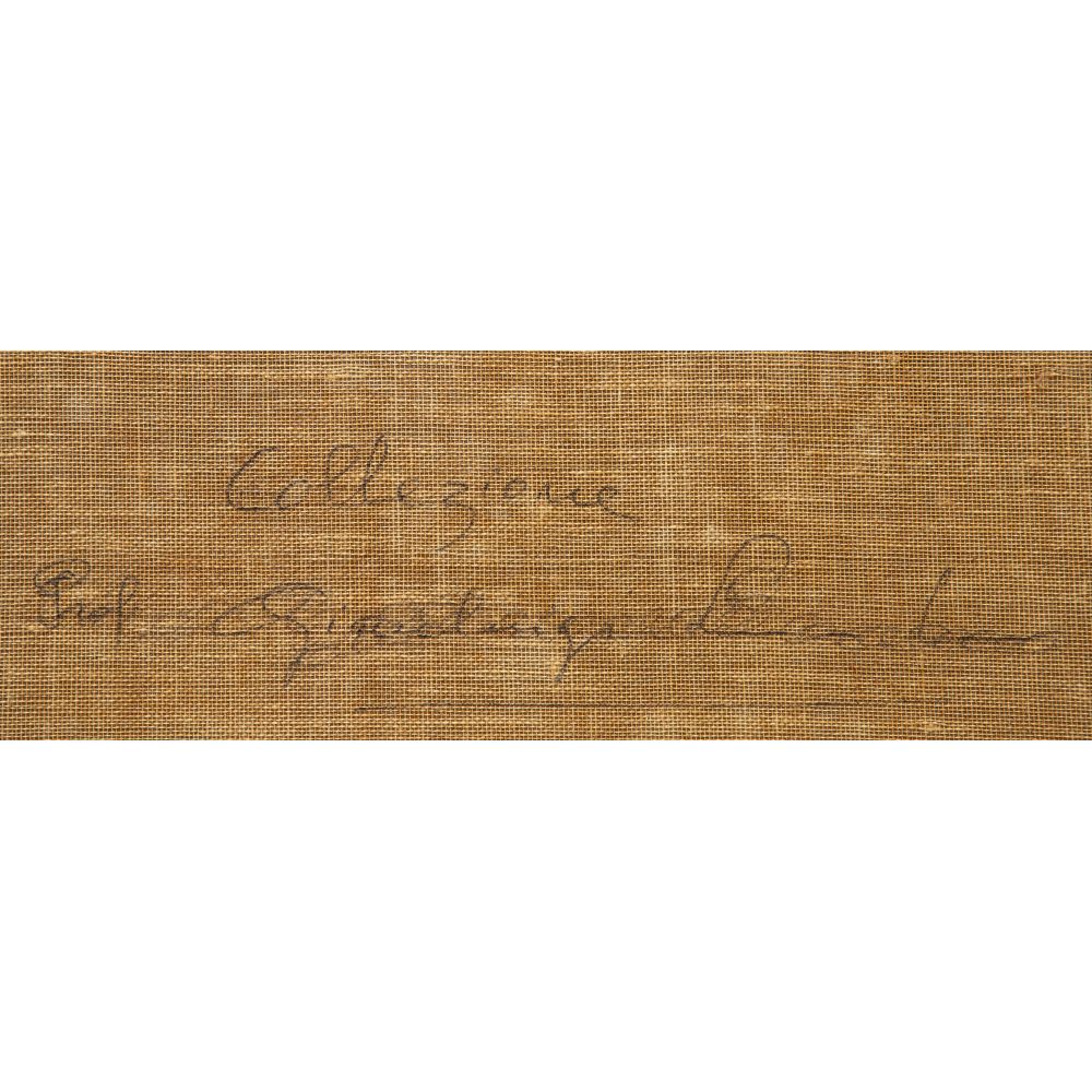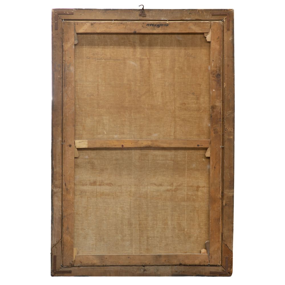 Condition: relined, inpainting, possible repaired tear upper left, horizontal ridge at midpoint may be from folding or a seam, moderate soil visible at light areas, frame having light wear, occasional chips, repair top right, paint loss, rust to metal parts of frame, relined, inpainting, possible repaired tear upper left, horizontal ridge at midpoint may be from folding or a seam, moderate soil visible at light areas, frame having light wear, occasional chips, repair top right, paint loss, rust to metal parts of frame