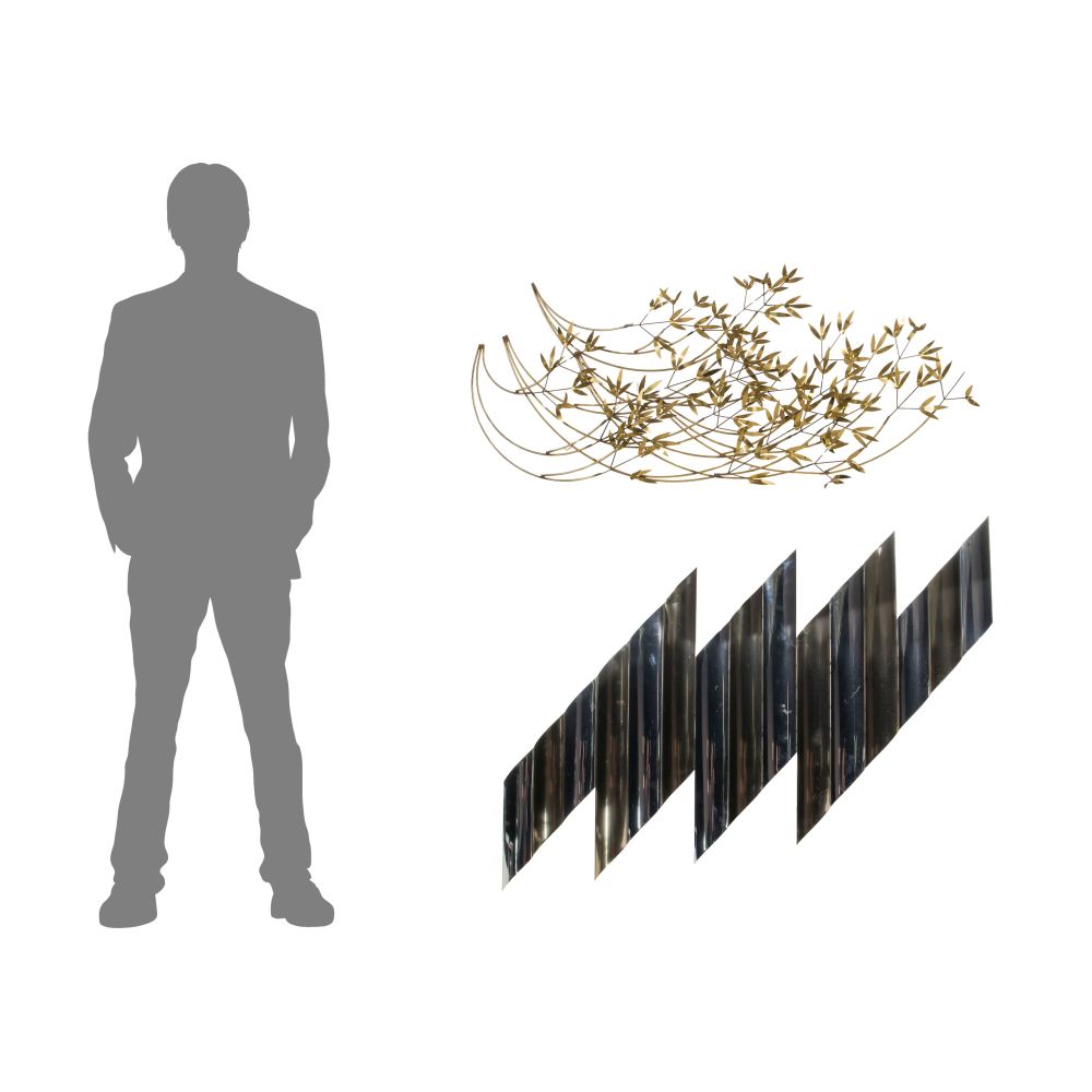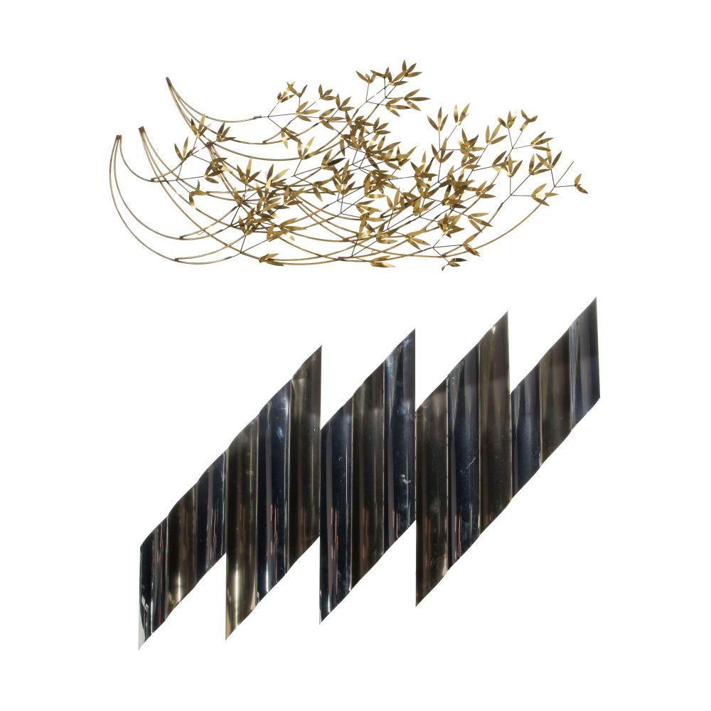 (2) items, 1985, both signed, including a two-tone metal wall sculpture in the form of a lightning bolt and a gold-tone metal sculpture of bamboo shoots with delicate leaves