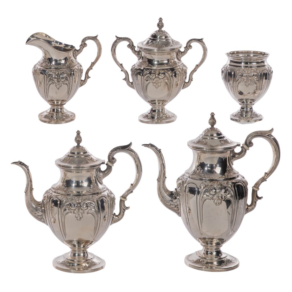 A hand-chased 5-piece beverage service including a teapot, a coffee pot, a covered sugar, a creamer and a waste bowl (all marked “sterling”)