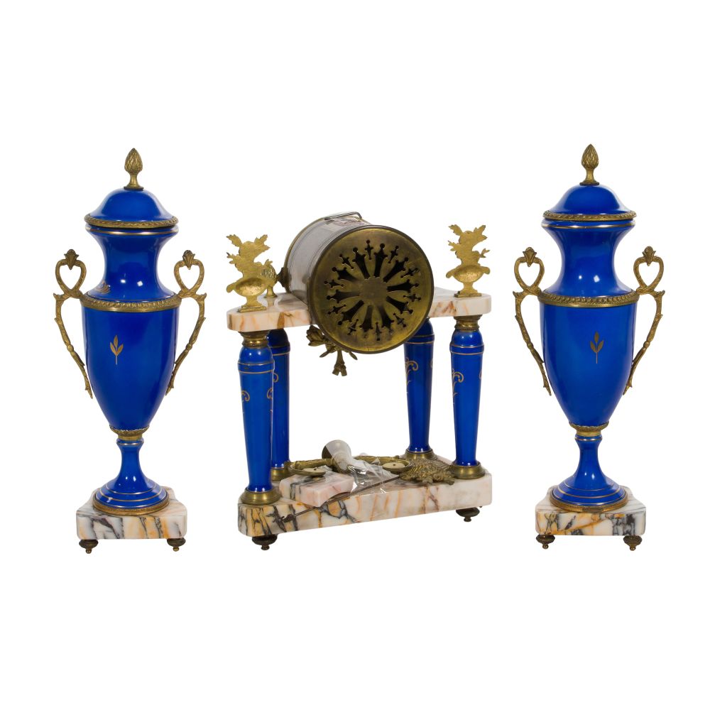 A clock set on four blue columns having a floral motif, stone base and brass accents as well as two matching urns, unmarked, including key