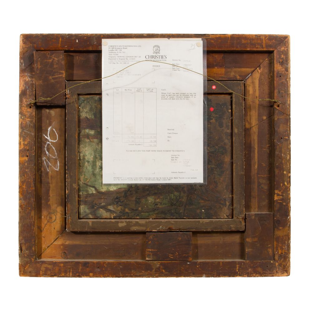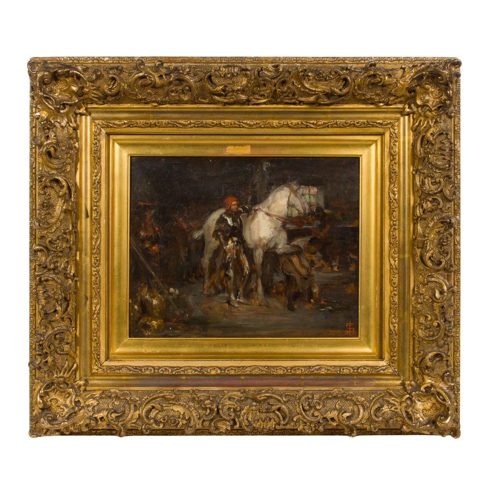 Undated, artist conjoined monogram “JS”, depicting a horse being shod (verso of board having a forest scene) in a gold-tone gesso on carved wood frame having faded “Solomon J. Solomon A.R.A.” below image, a Christie’s, London receipt giving artist and title
