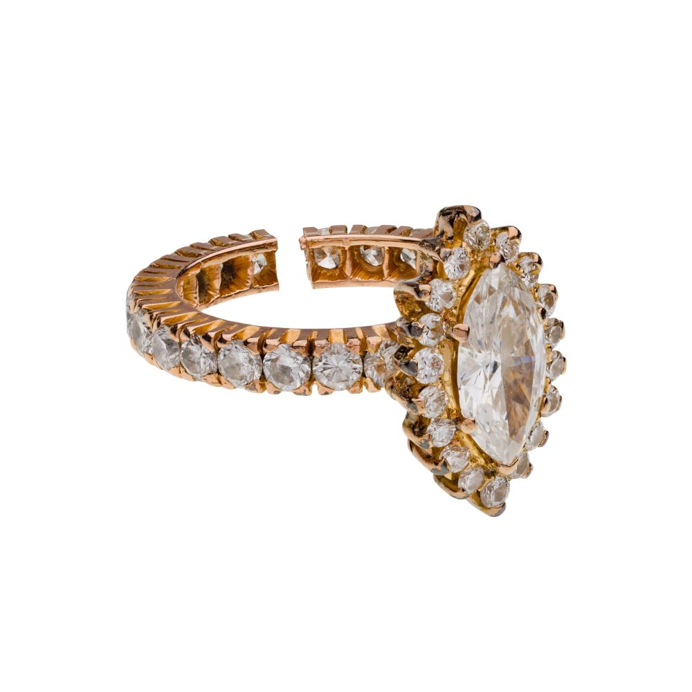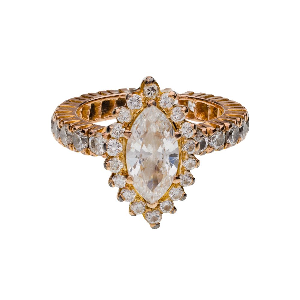 A marquise cut center diamond, approximately 0.93 carat (10.39 x 5.17 x 2.75mm), I/J color, SI clarity, surrounded by round cut diamonds on an eternity band (unmarked 12k)