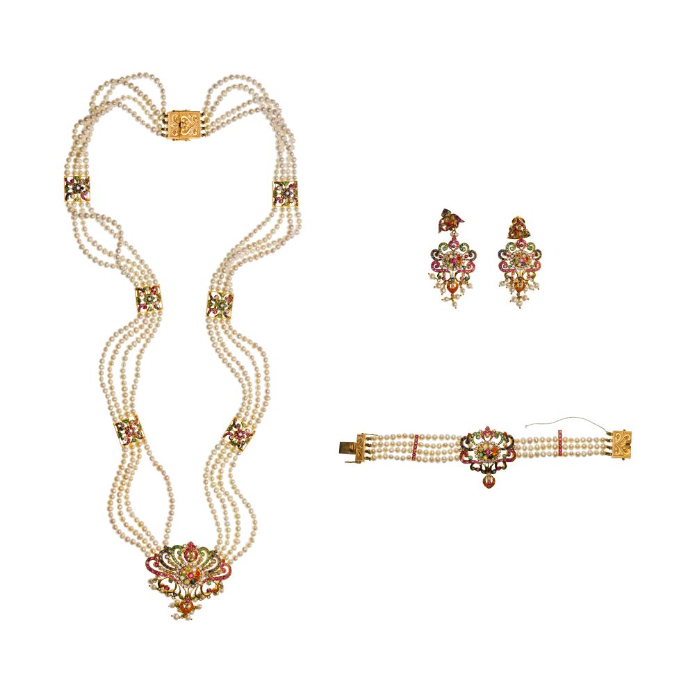 14k Yellow Gold, Seed Pearl and Gemstone Jewelry Suite