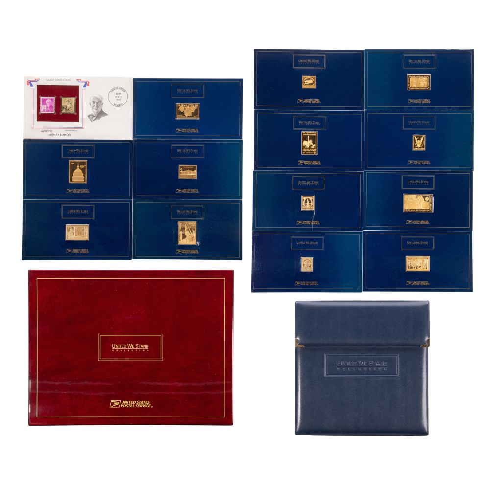 (14) ingots in 0.999 fine silver and 24K gold plate, a lacquered wood collectors chest, COA from the United States Postal Service, cards and a collectors album as well as a Thomas Edison ingot stamp