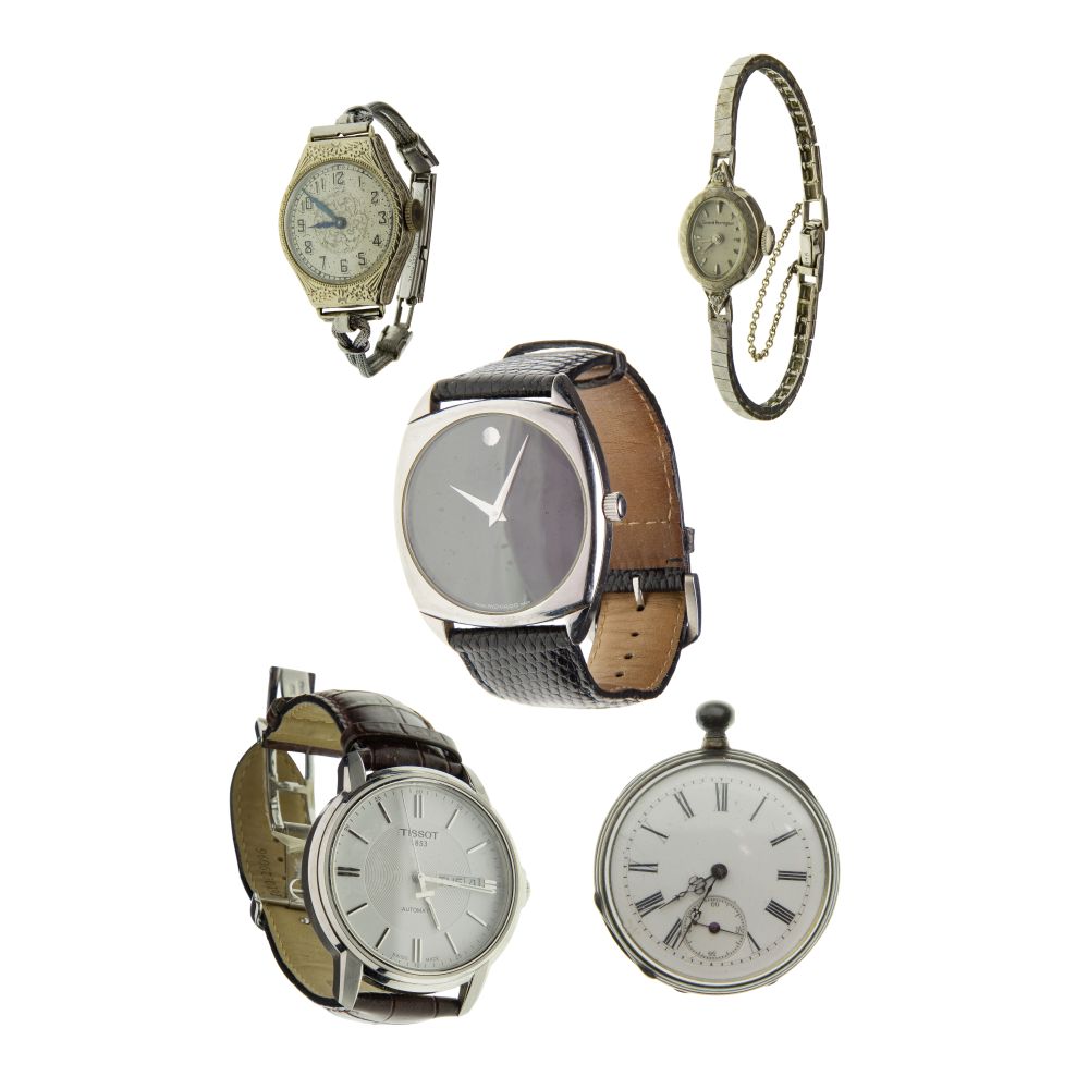 Condition: overall light to moderate wear consistent with normal use, gold having scratches, minor face damage, pocket watch having scratches and tarnish, Movado having marks on crystal, Movado and Tissot working when tested, other three not working when tested, overall light to moderate wear consistent with normal use, gold having scratches, minor face damage, pocket watch having scratches and tarnish, Movado having marks on crystal, Movado and Tissot working when tested, other three not working when tested