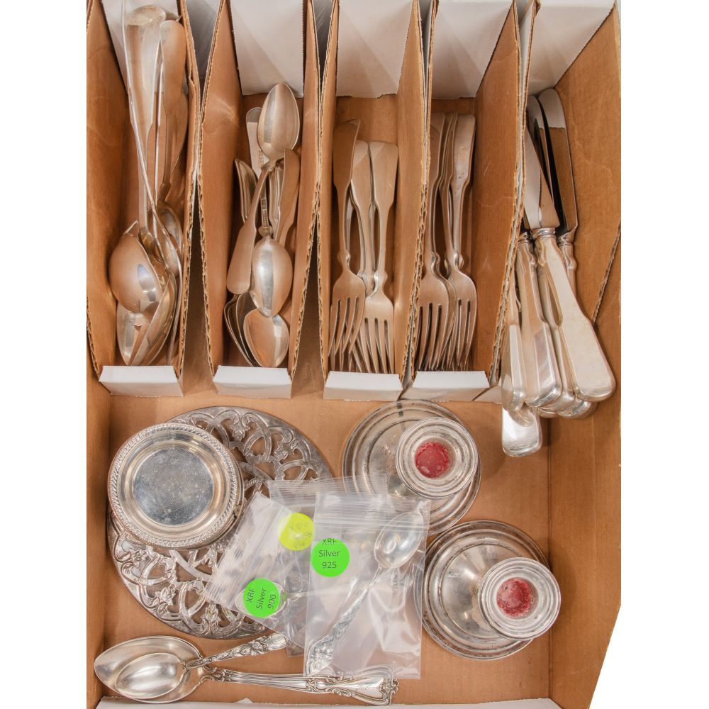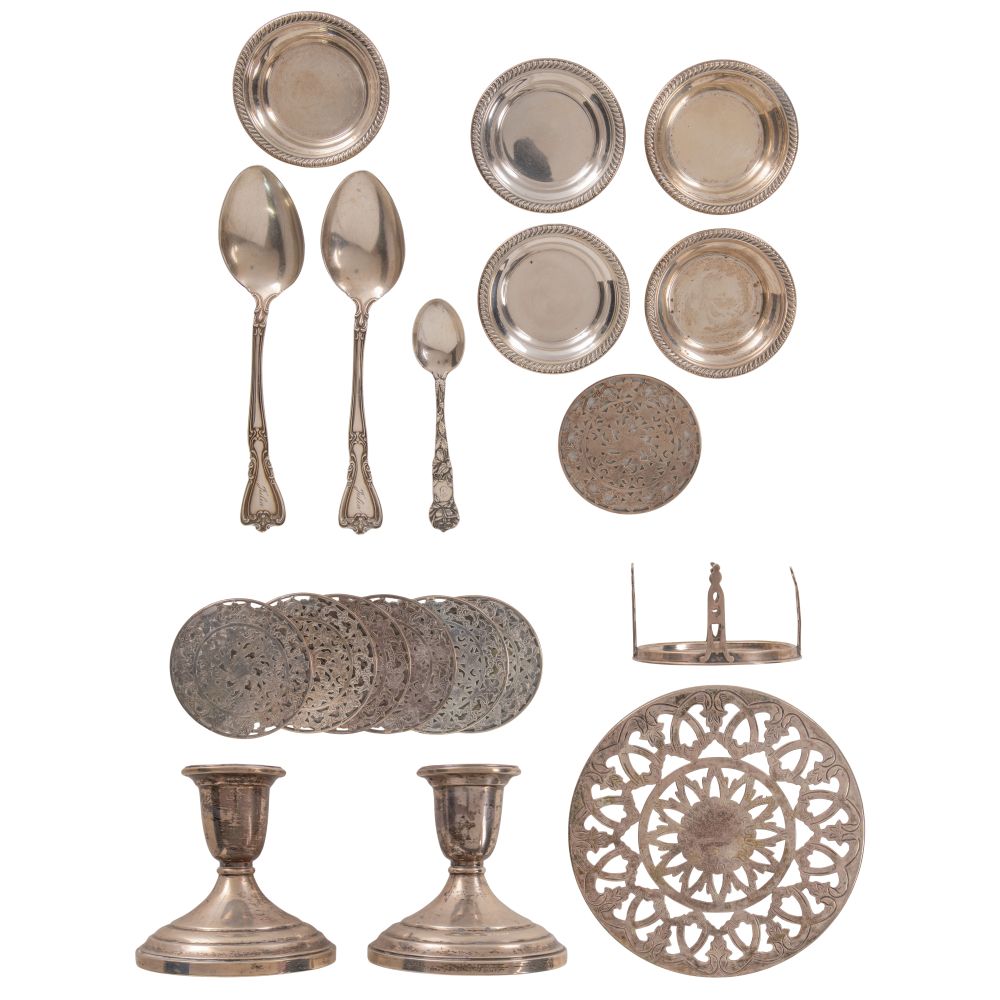 (55) total items including (8) 9 1/2-inch dinner knives, (8) 7 1/2-inch dinner forks, (8) 6 3/4-inch salad forks, (8) 6-inch teaspoons, (5) serving utensils (all marked “sterling” or “sterling handle”); together with (2) S Kirk & Son weighted silver candle holders, a glass trivet and coasters set in holder having silver overlay, a five-piece nut cup set and (4) spoons (most marked “sterling”) as well as (2) spoons (unmarked 900 silver) and a spoon (unmarked 830 silver)