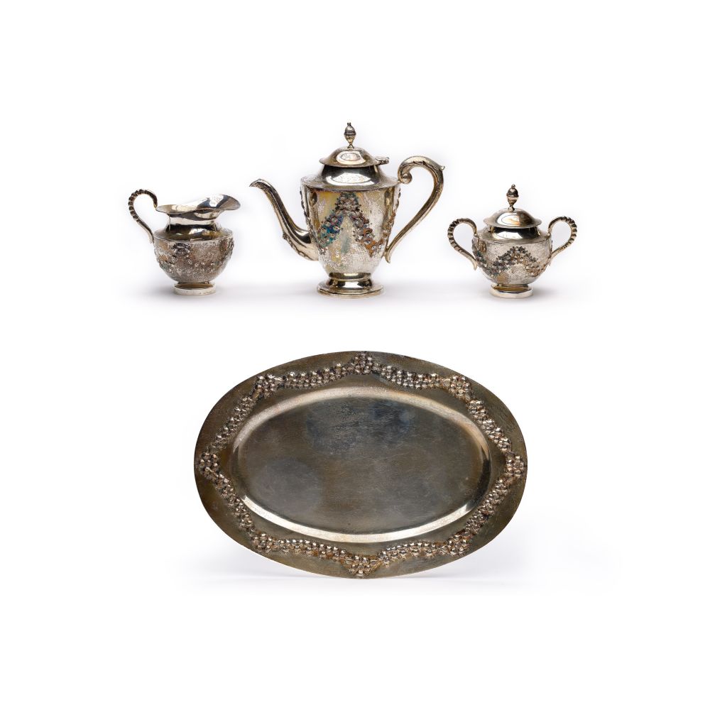 (4) items including a teapot, a creamer, a covered sugar and a tray (all marked “sterling” and “930”)