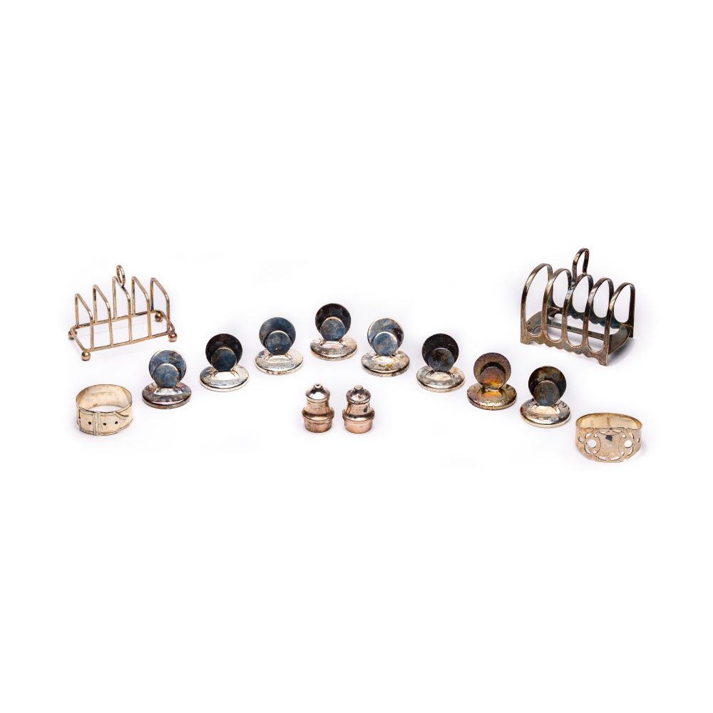 (14) total items including (2) napkin rings, set of salt and pepper shakers and (2) toast holders; together with a set of (8) weighted place card holders by “WW” (all marked “925”/ lion passant)
