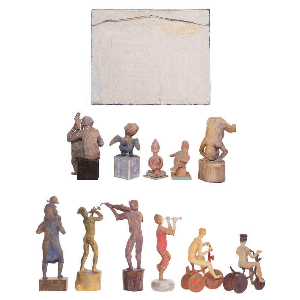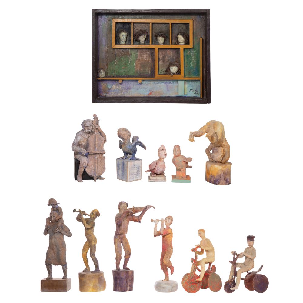 (12) items including a box style frame with heads on shelves and (10) figurines of various shapes, sizes, motifs and materials, all signed with artist’s cypher
