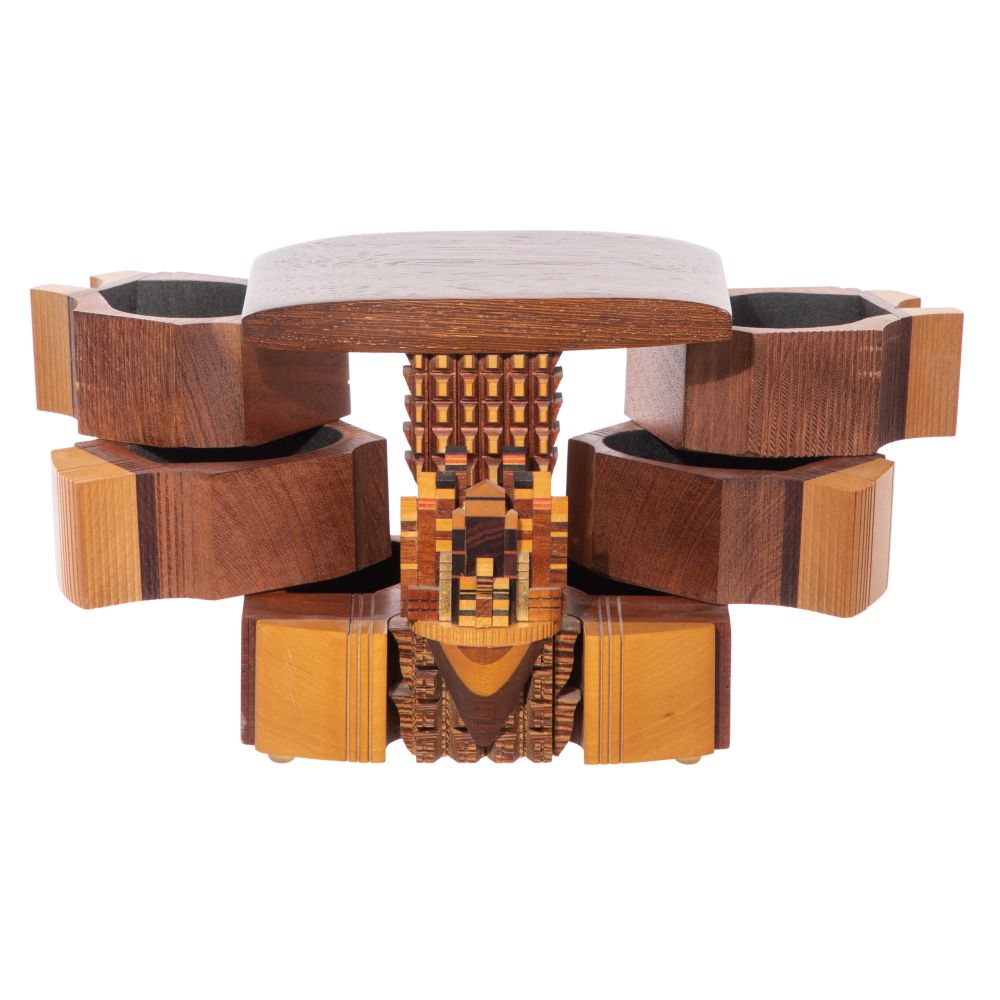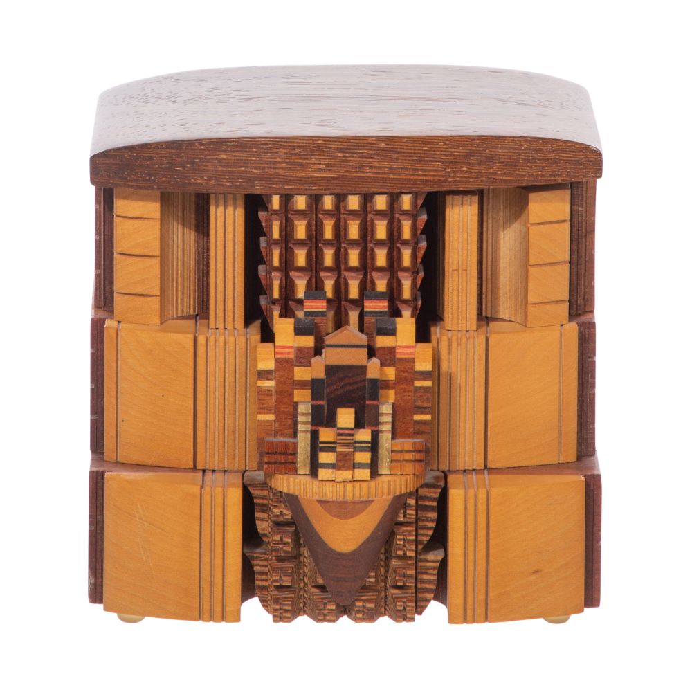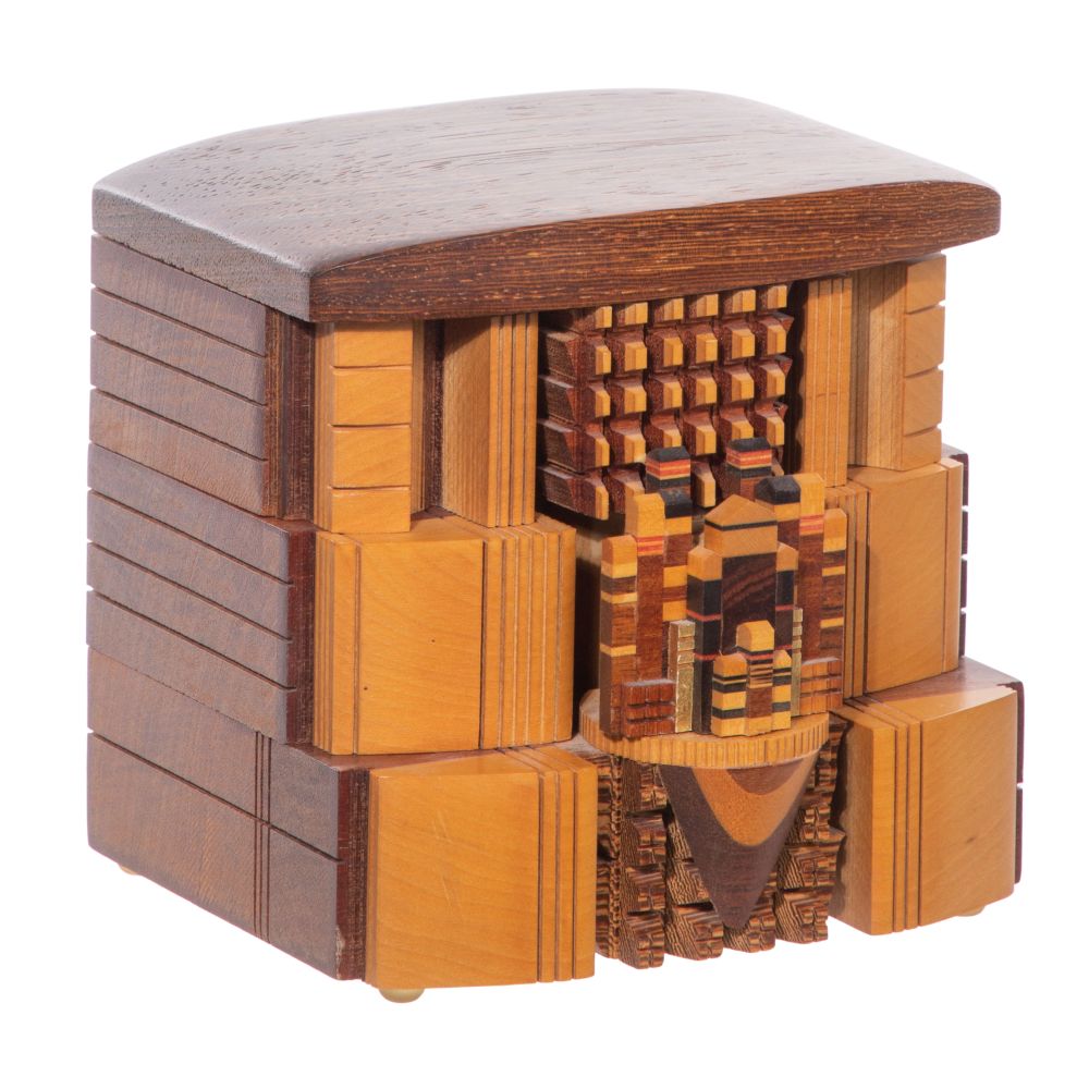 1995, signed, a wooden puzzle box made in maple, mahogany and other woods having hand carved landscape motif