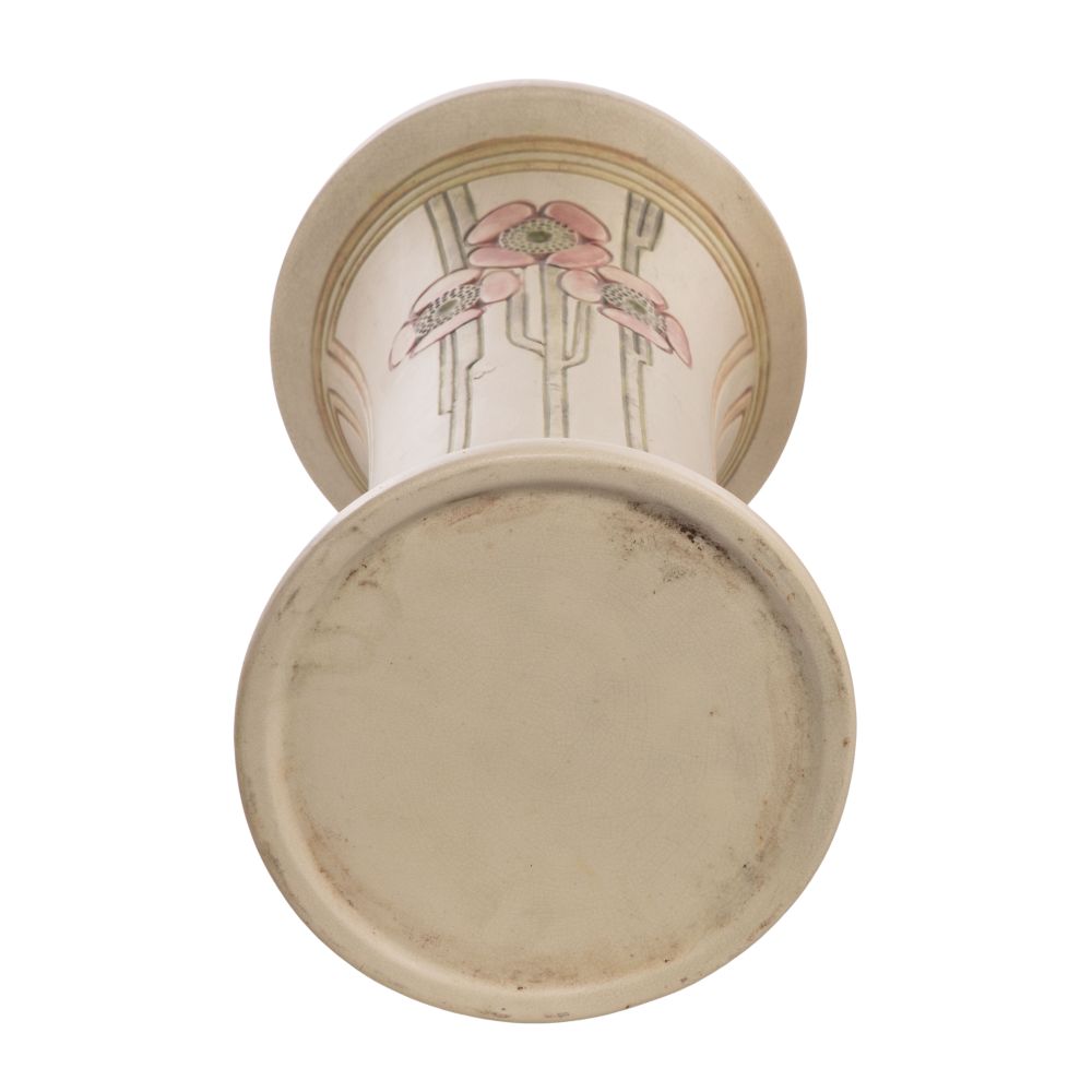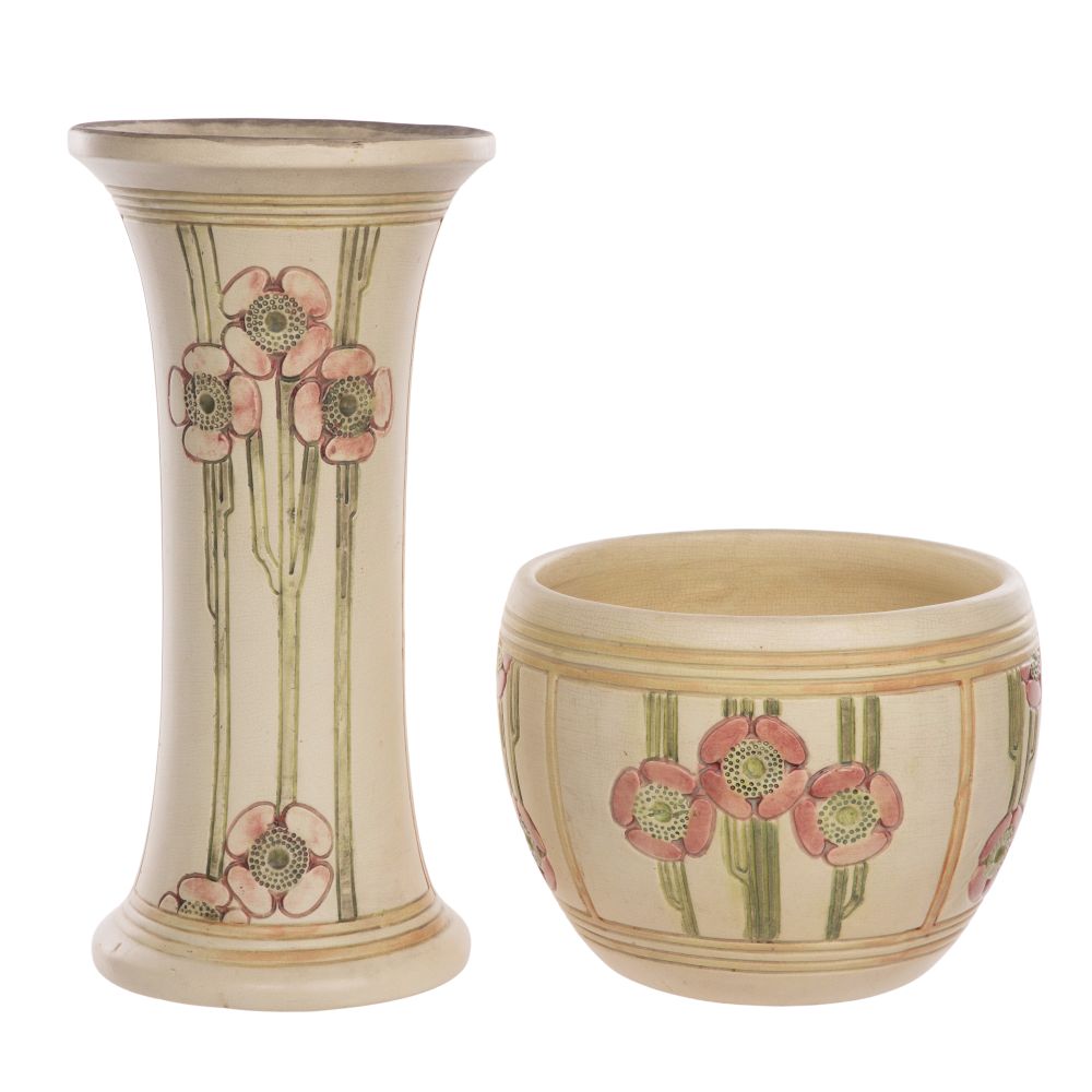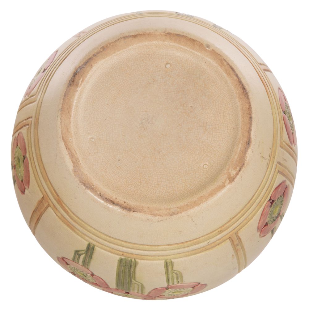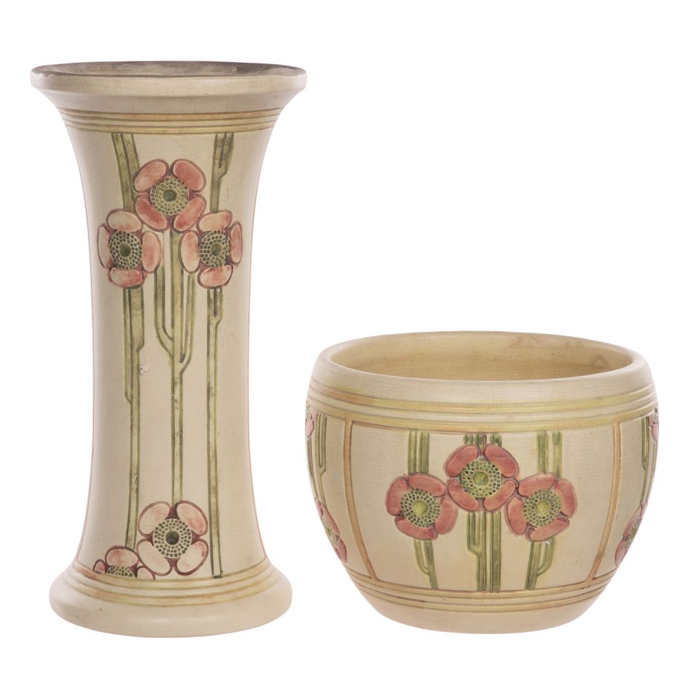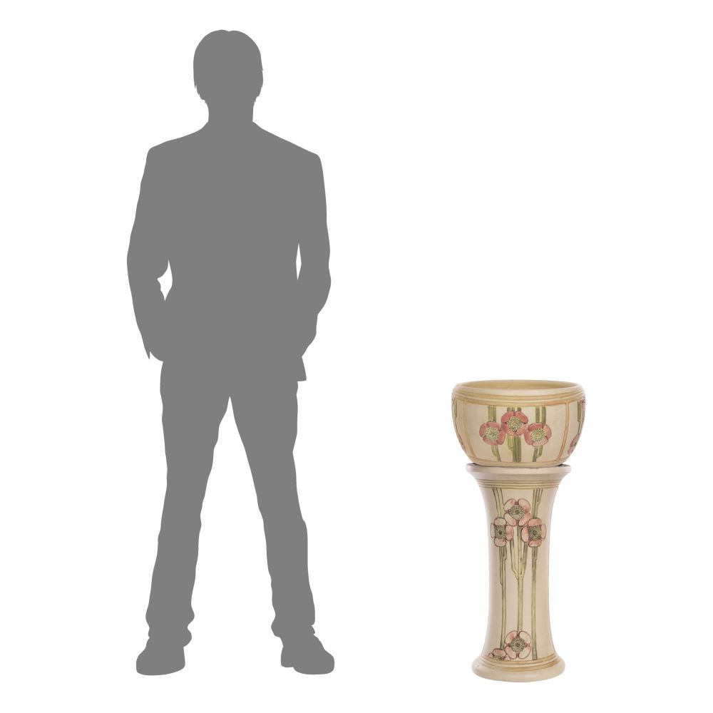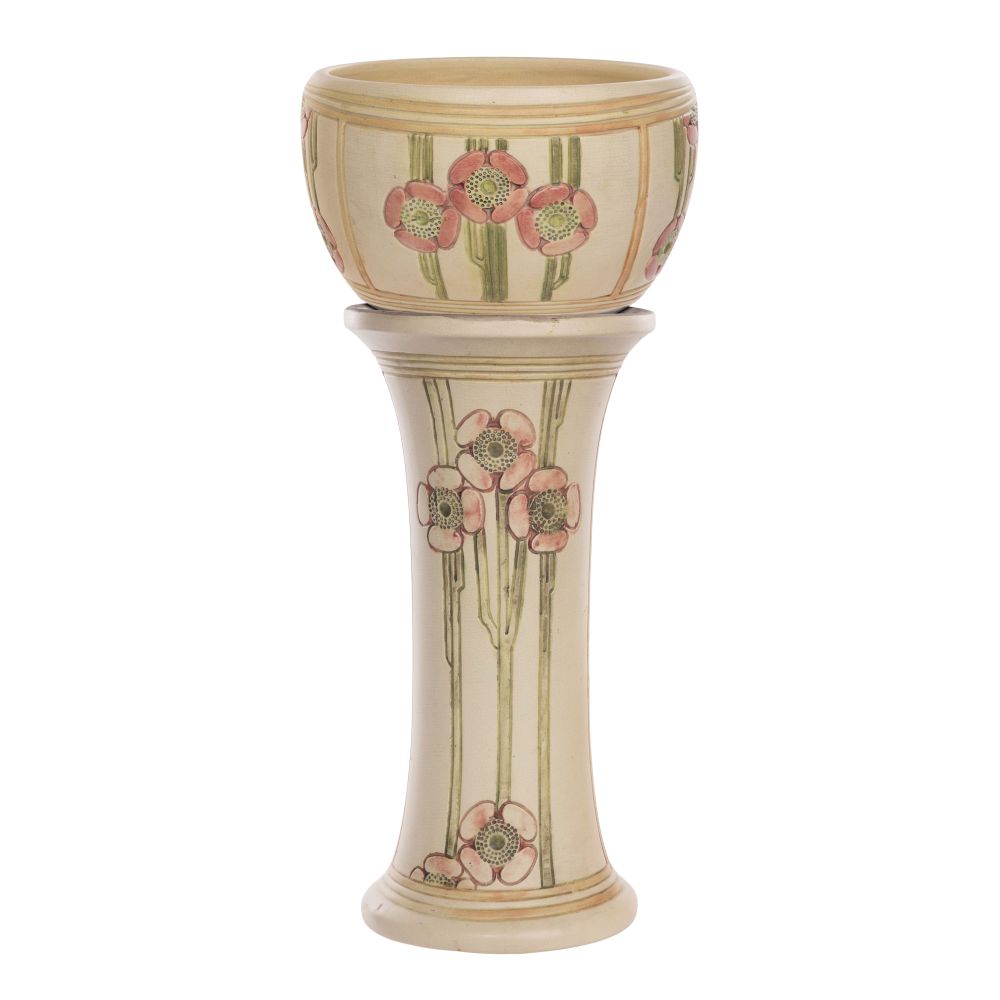 c.1925, designed by Rudolph Lorber (1873-1952) in the Flemish motif, a cream-colored pedestal and jardiniere having incised, stylized pink flowers on long green stems, unmarked