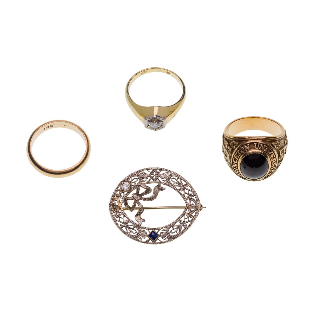 (4) items including a band having a round cut diamond, a plain band and a diamond accented filigree brooch (most marked “14k”) as well as a Princeton University school ring (marked “10k”)