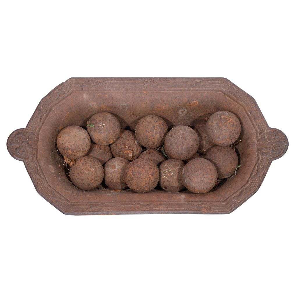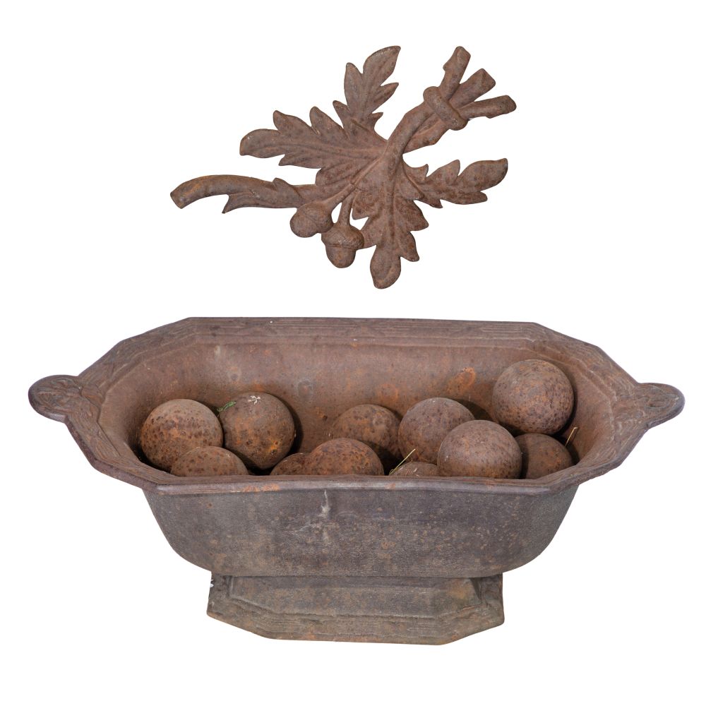 Jardiniere containing (17) 3-inch three pound cannon balls; together with a cast iron oak sprig