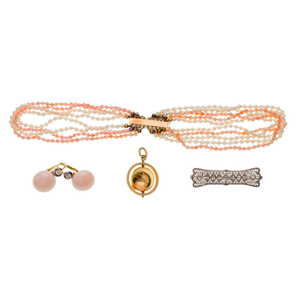 (4) items including a pair of hardstone earrings topped by round cut diamonds (earrings marked “18k” / “750”), a globe pendant, a beaded bracelet (unmarked 18k) and a Victorian style pin (marked “10k”)