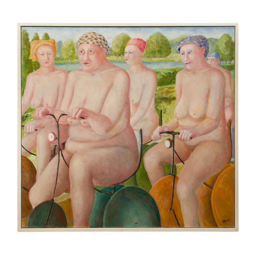 2001, signed and dated, depicting Rubenesque nudes on tricycles, having a painted wood frame