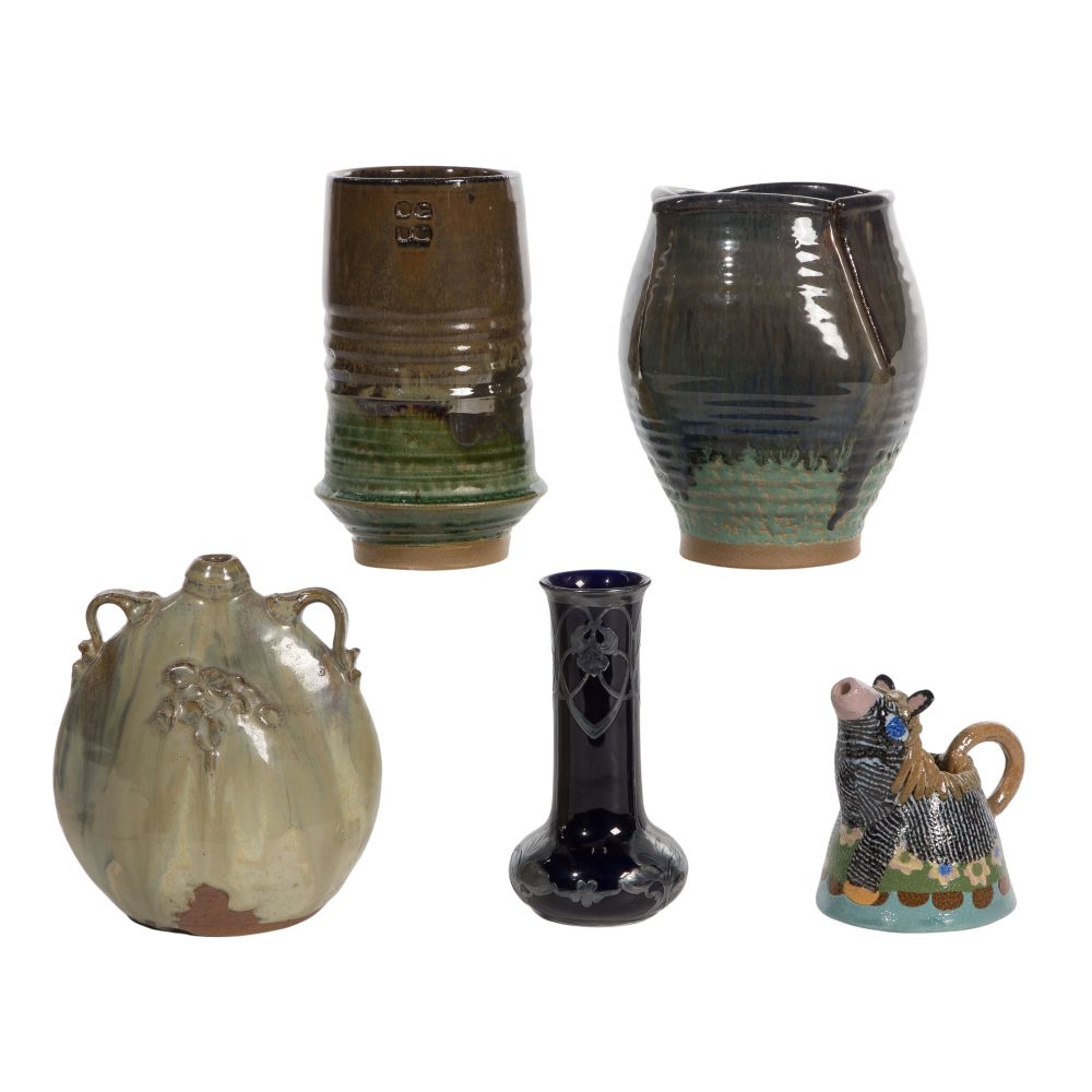 (5) items including a Jane Peiser (American, 1933-2022) hand formed creamer, signed to underside, as well as (3) illegibly hand thrown vases and a cobalt vase having silver overlay