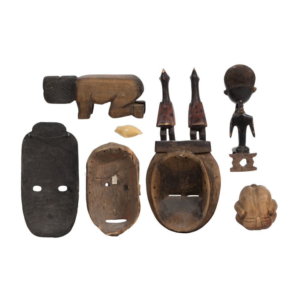 (7) items, (3) masks including a Senufu, a Dan and a Papau as well as a carved maternity figure, a weeping Buddha, a Feely Sealy composite figure signed “Perry” and a carved figure on all fours