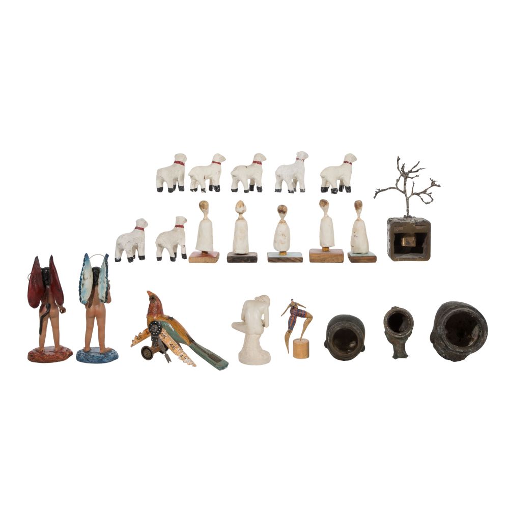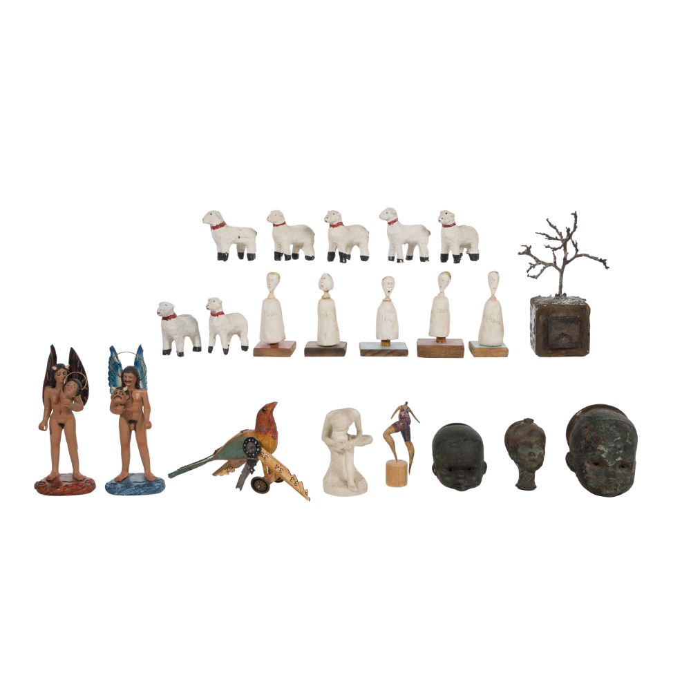 (21) items including (5) ceramic finger puppets signed “Rose”, (7) ceramic Sheep, (2) nefarious naked figures holding an angel and devil head signed “Goche”, (3) brass and copper doll head molds, a steampunk bird signed “Jim and Tori Mullan” as well as a wood figure, tree sculpture and a marble statue