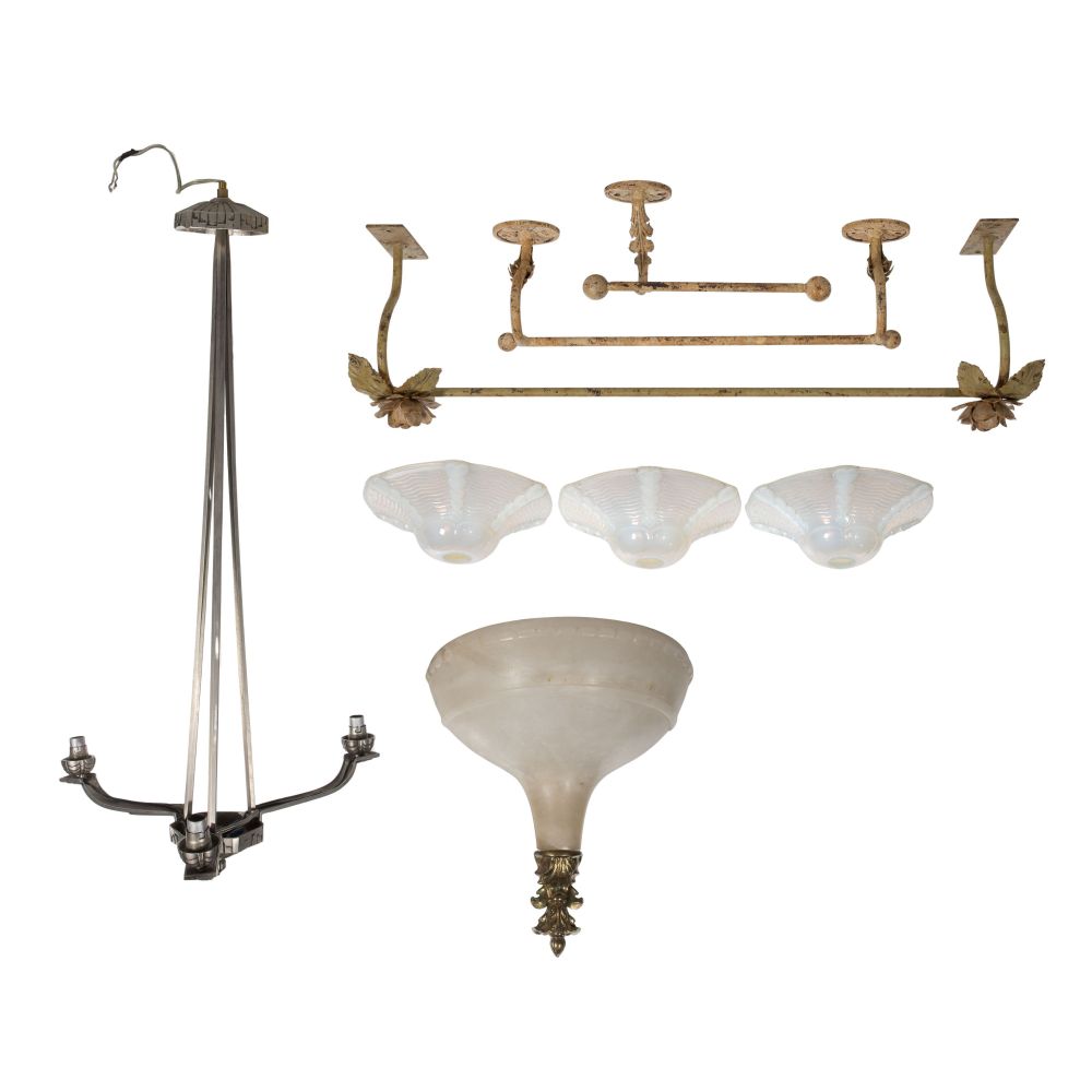 (5) items including an art deco style three-arm chandelier having iridescent shades, a classical sconce having an alabaster shade and a set of (3) towel bars having foliage motif