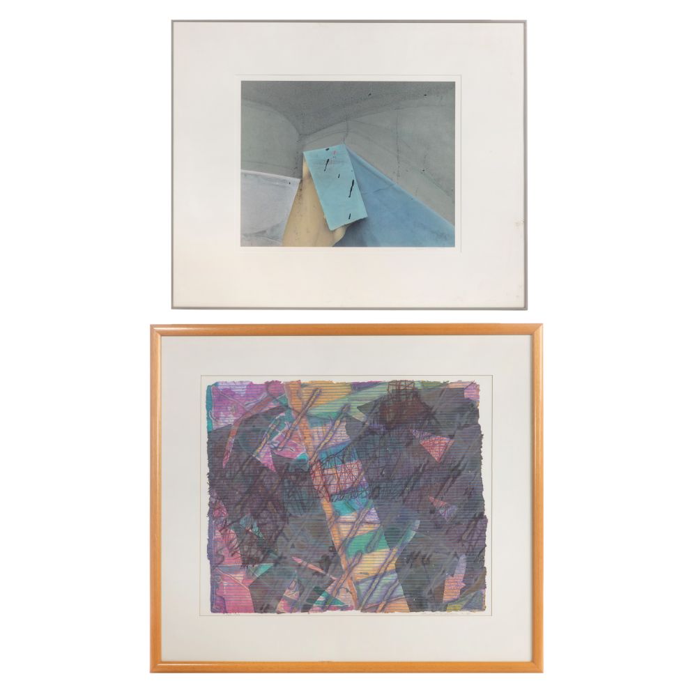 (2) total items including a 1987 abstract Markley lithograph, pencil signed; together a 1991 illegibly signed abstract lithograph, both matted under acrylic in wood frames