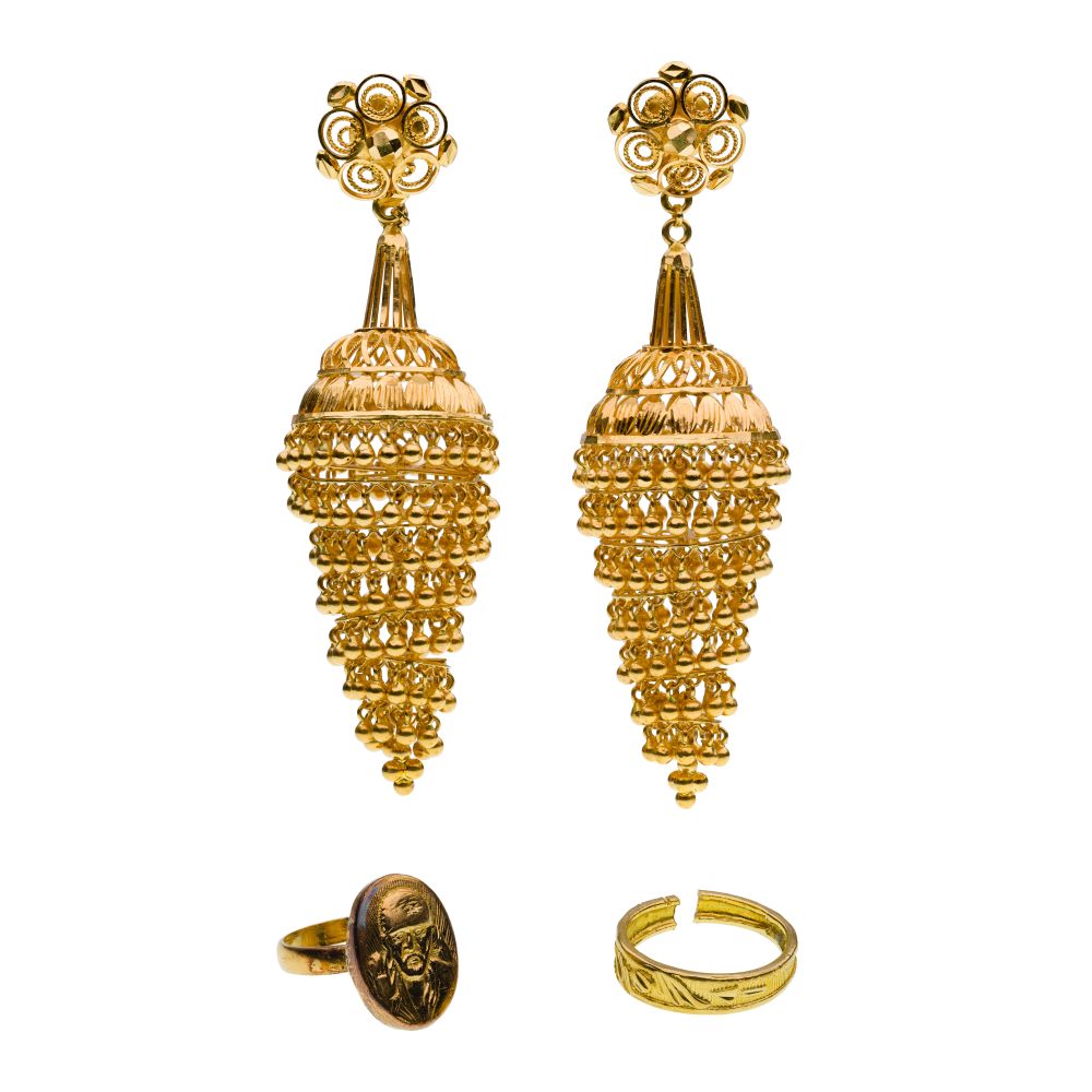 (3) items including a band style ring, a ring having an image in relief and a pair of chandelier style earrings (all unmarked 22k)