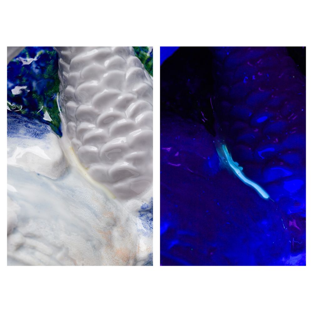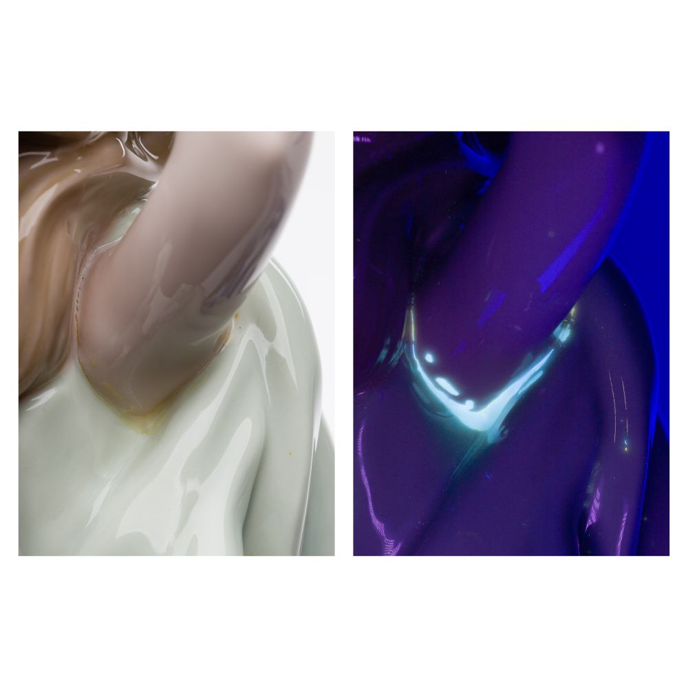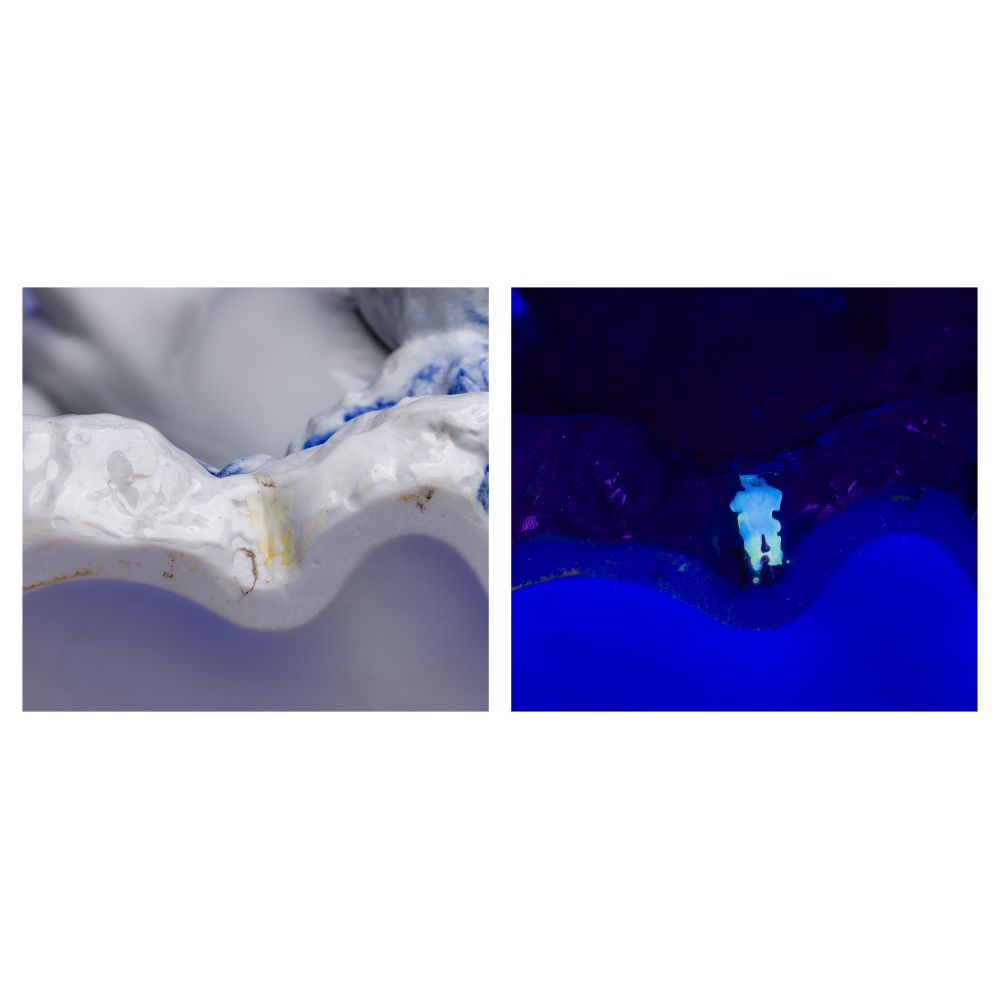 Condition: no chips noted, black light showing evidence of glue, possibly original or repairs, box having heavy wear and holes, no chips noted, black light showing evidence of glue, possibly original or repairs, box having heavy wear and holes