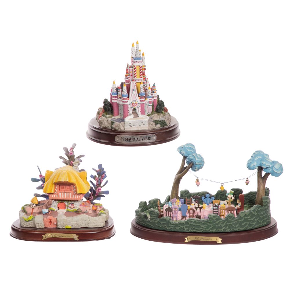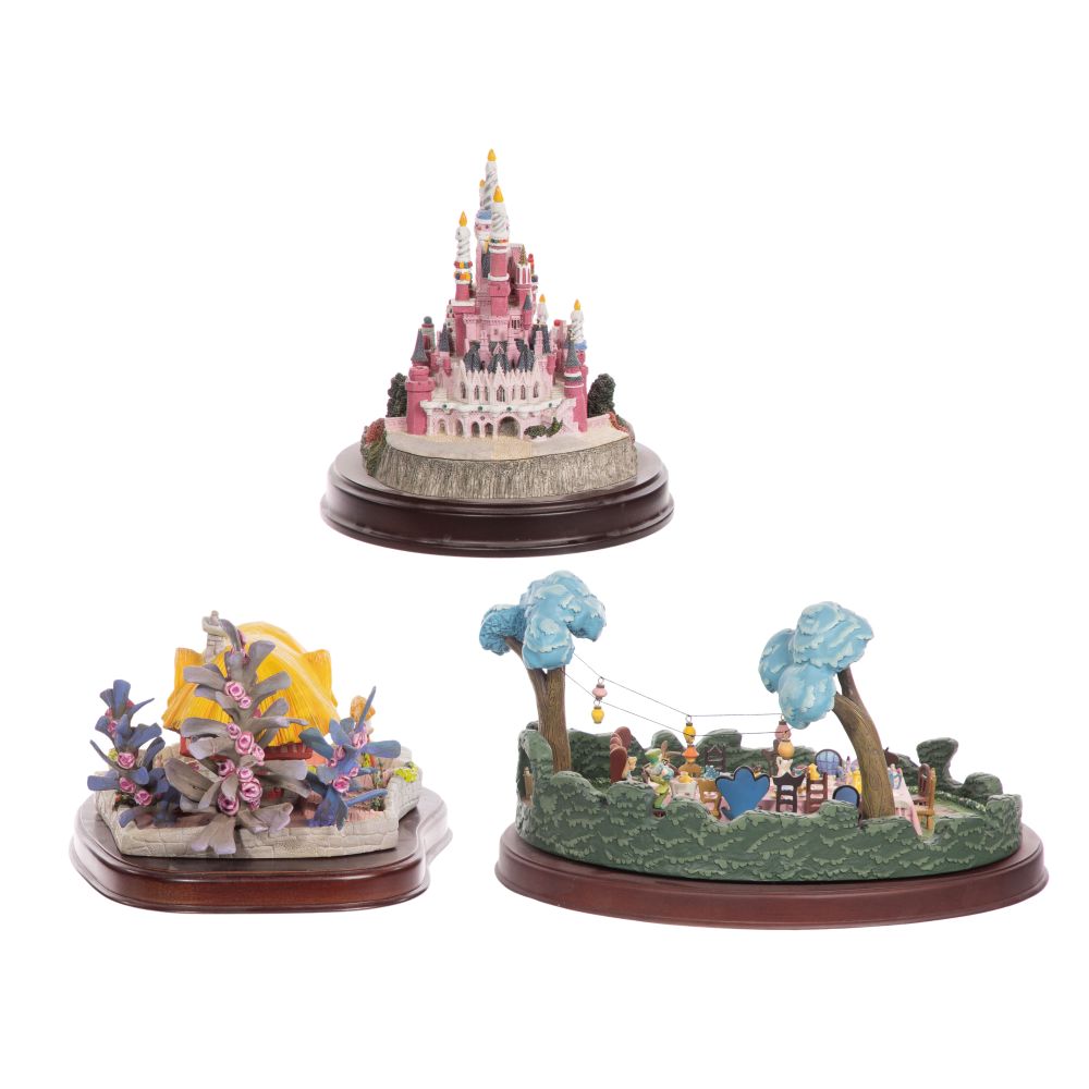 (3) resin items including “White Rabbit’s House” and “Tea Party in Wonderland” from “Alice in Wonderland”; together with a signed “25 Magical Years Castle”, all set on wood bases having title plaques, all marked on underside