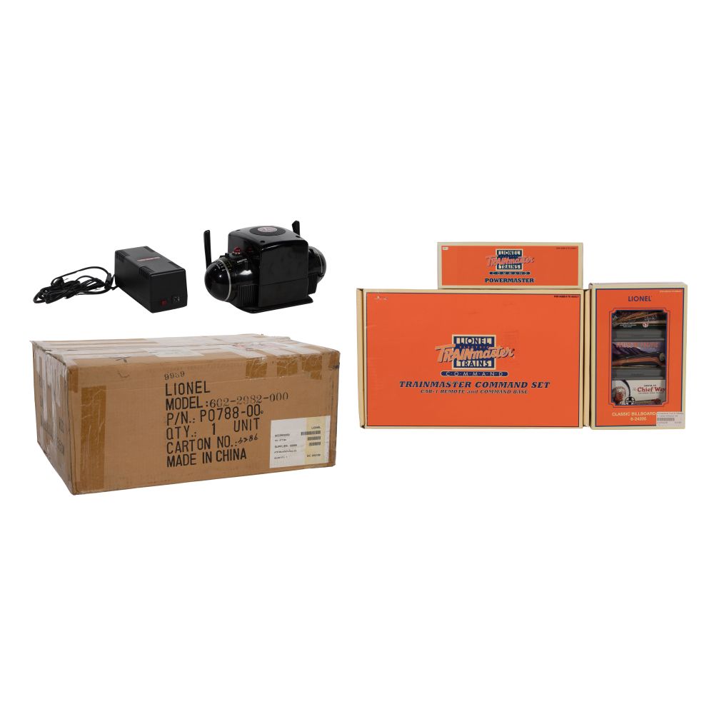 (4) items including a #12969 “O TrainMaster CAB1 Command Set” remote and base, a #12867 “O PM-1 TrainMaster Command” power-master switch controller, a #24205 “Classic Billboard Set” and a #22982 “O ZW Postwar Celebration Series” controller and transformers, in original boxes
