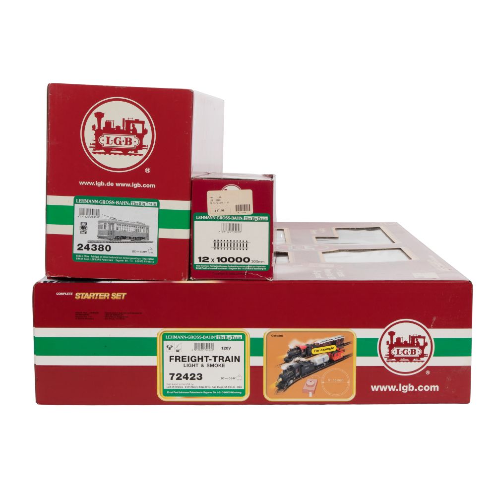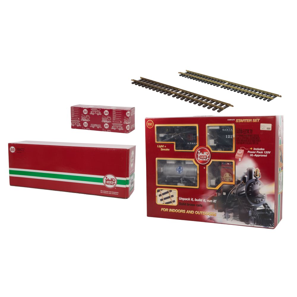 (5) total items including #24380 Chicago Street Car, a #72423 Santa Fe freight train starter set having light and smoke and a #10000 Straight Track 300 mm, all in original boxes; together with (2) extra pieces of straight track
