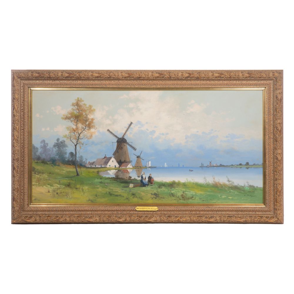 Undated, signed, depicting the Dutch North Dike having windmills and figures at the edge of the water, behind glass in a gold-tone gesso on wood frame having a brass title label